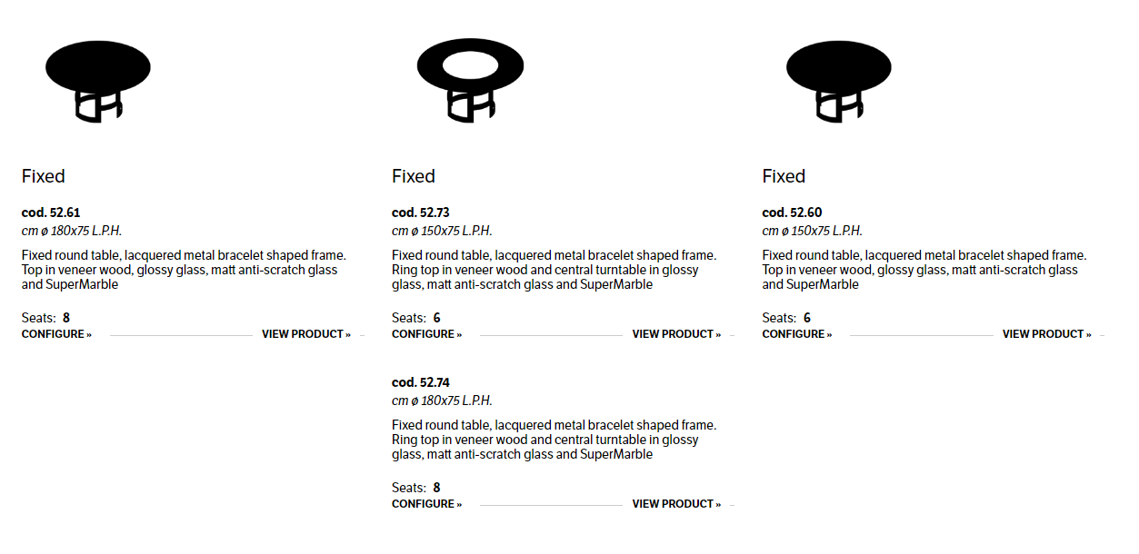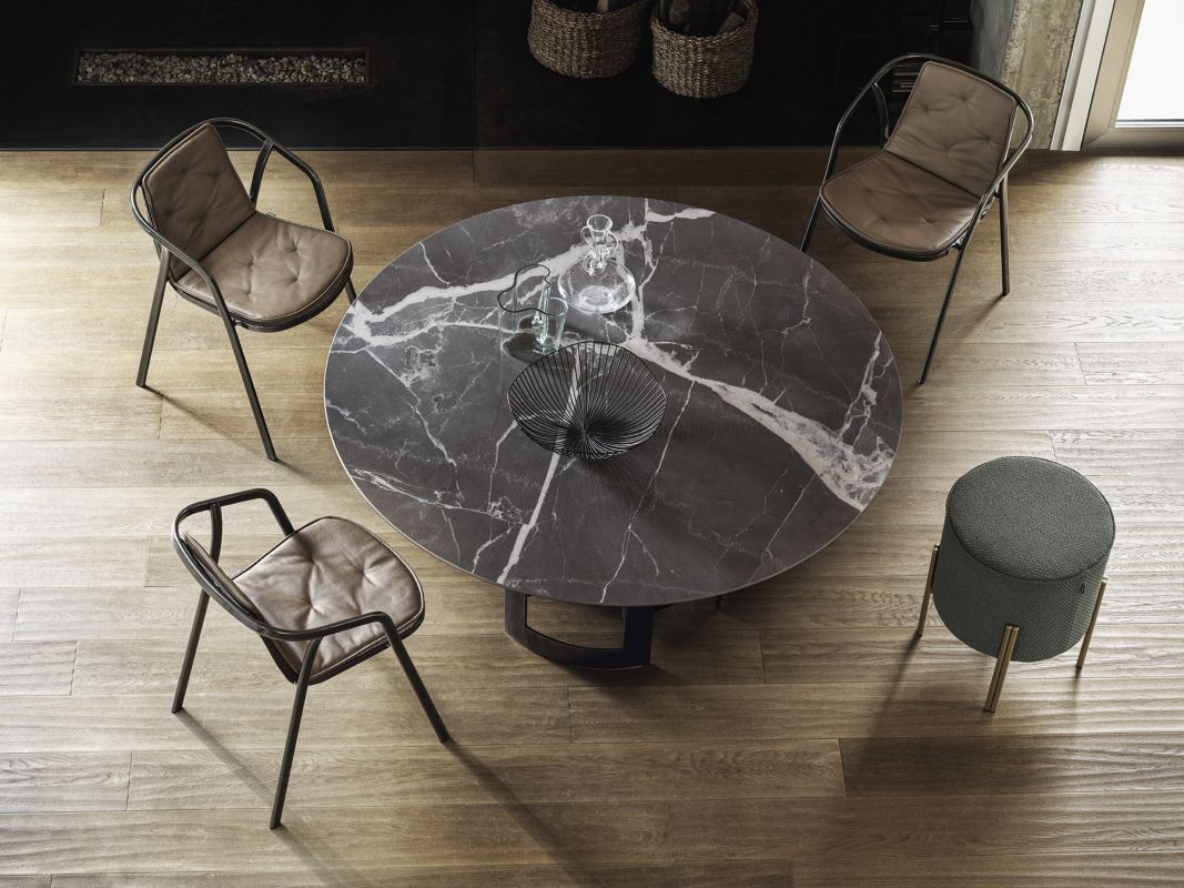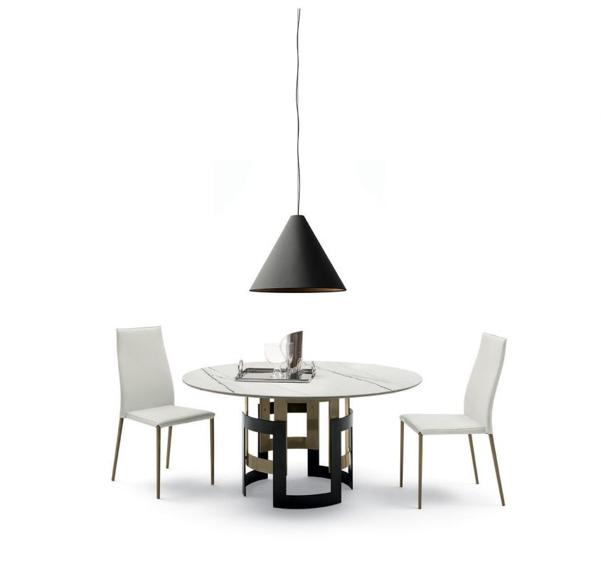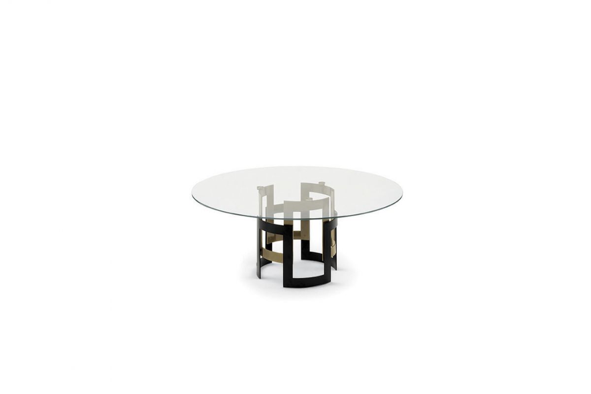 Fixed round table, lacquered metal bracelet shaped frame. Standard top in veneer wood, glossy glass, matt anti-scratch glass or ring top with central tunrtable in glossy glass, matt anti-scratch glass or SuperMarble.