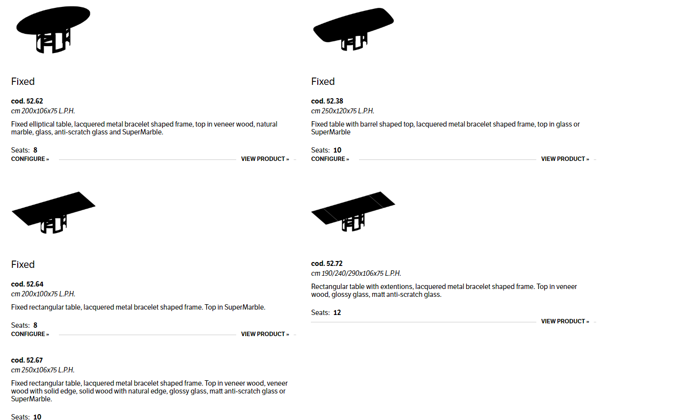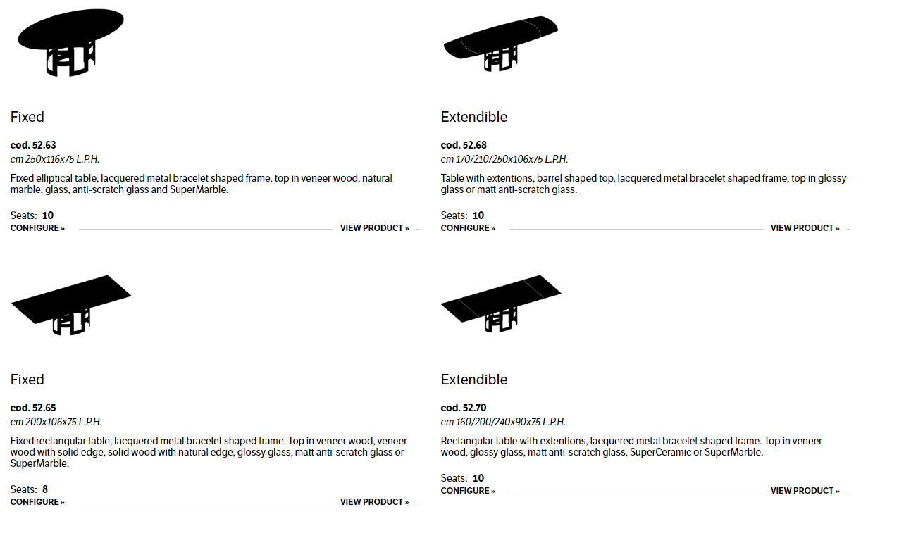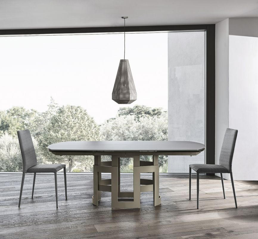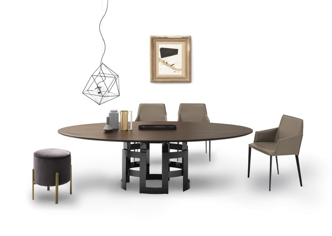 Table with elliptical, barrel shaped or rectangular top, fixed or with extentions, in veneer wood, veneer wood with solid edge, solid wood with natural edge, glossy glass, matt anti-scratch glass, SuperCeramic, SuperMarble or natural marble. Lacquered metal bracelet shaped frame.