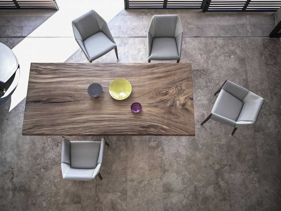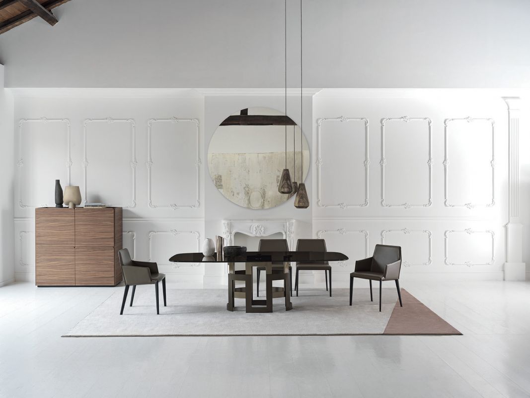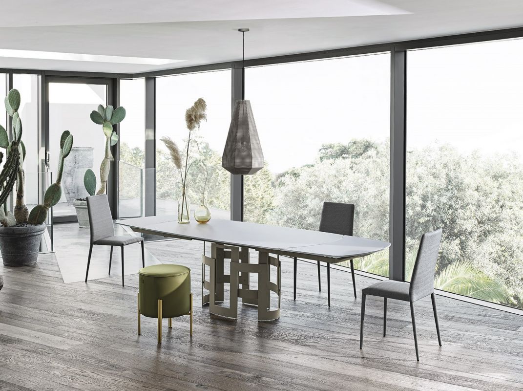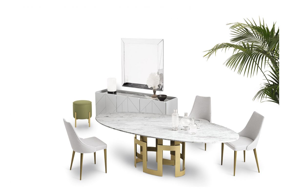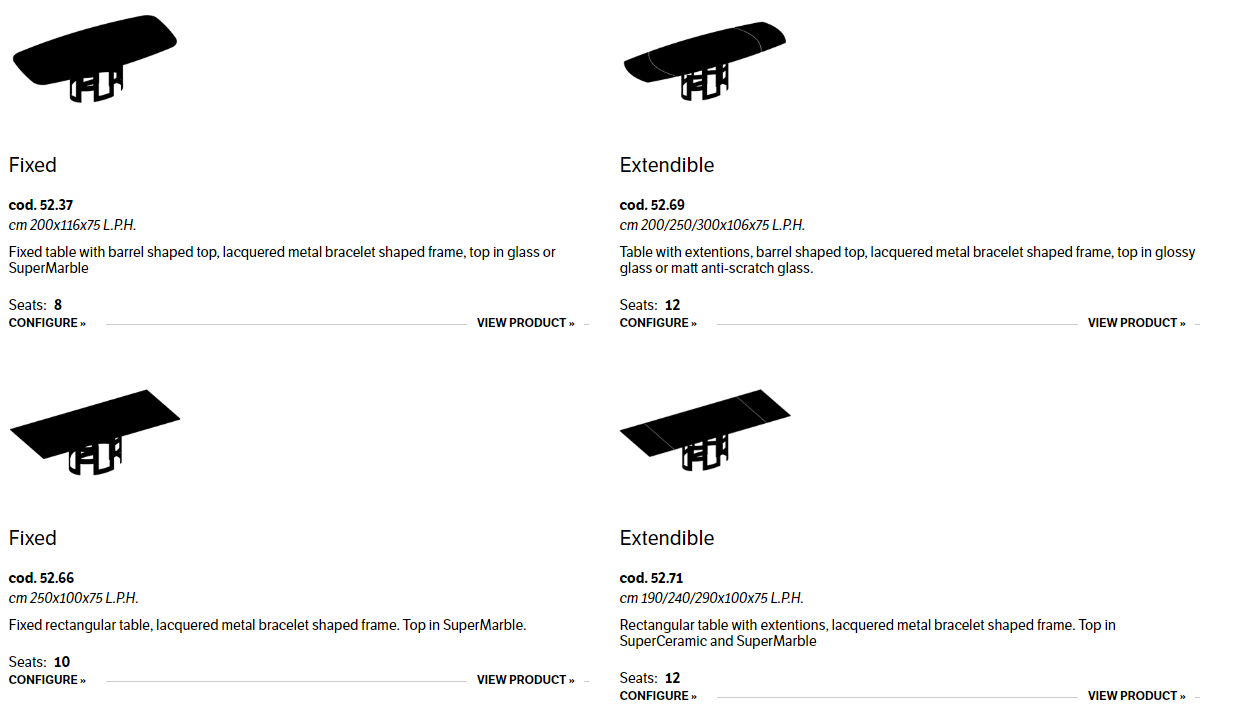 Table with elliptical, barrel shaped or rectangular top, fixed or with extentions, in veneer wood, veneer wood with solid edge, solid wood with natural edge, glossy glass, matt anti-scratch glass, SuperCeramic, SuperMarble or natural marble. Lacquered metal bracelet shaped frame.