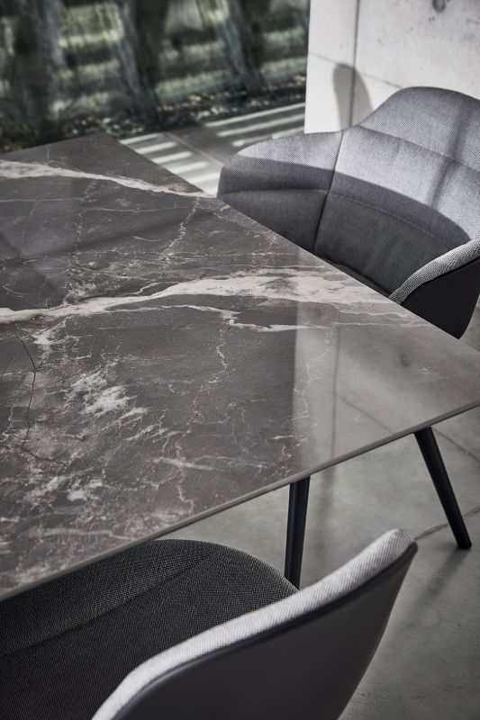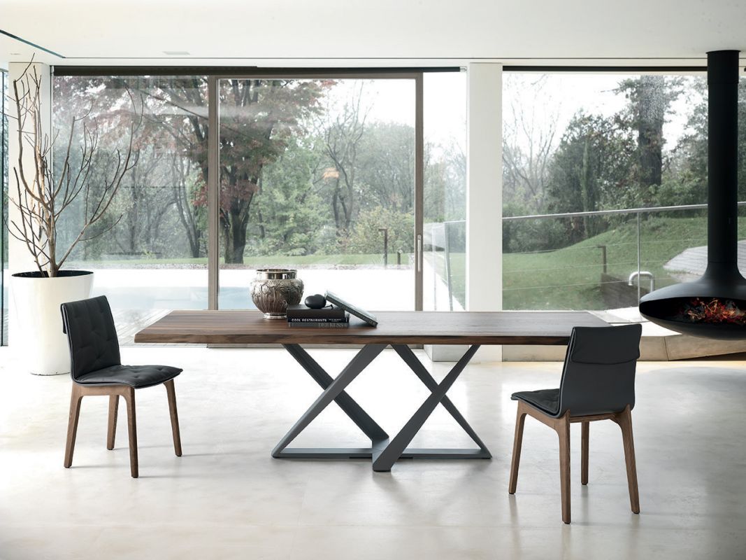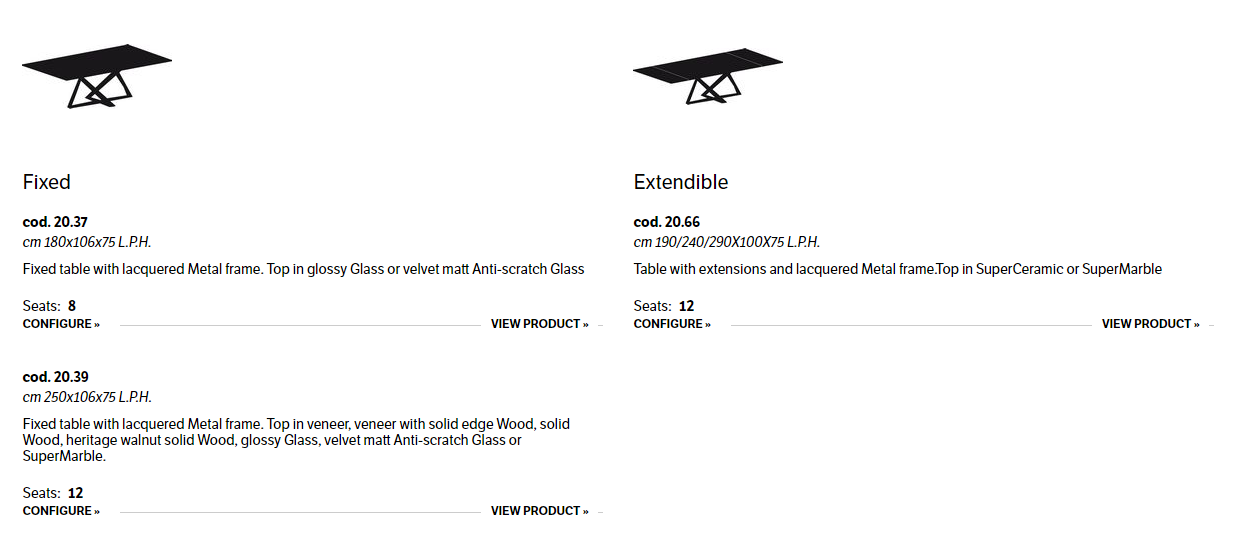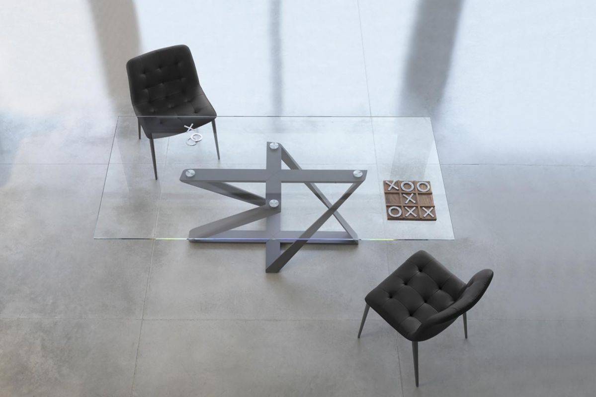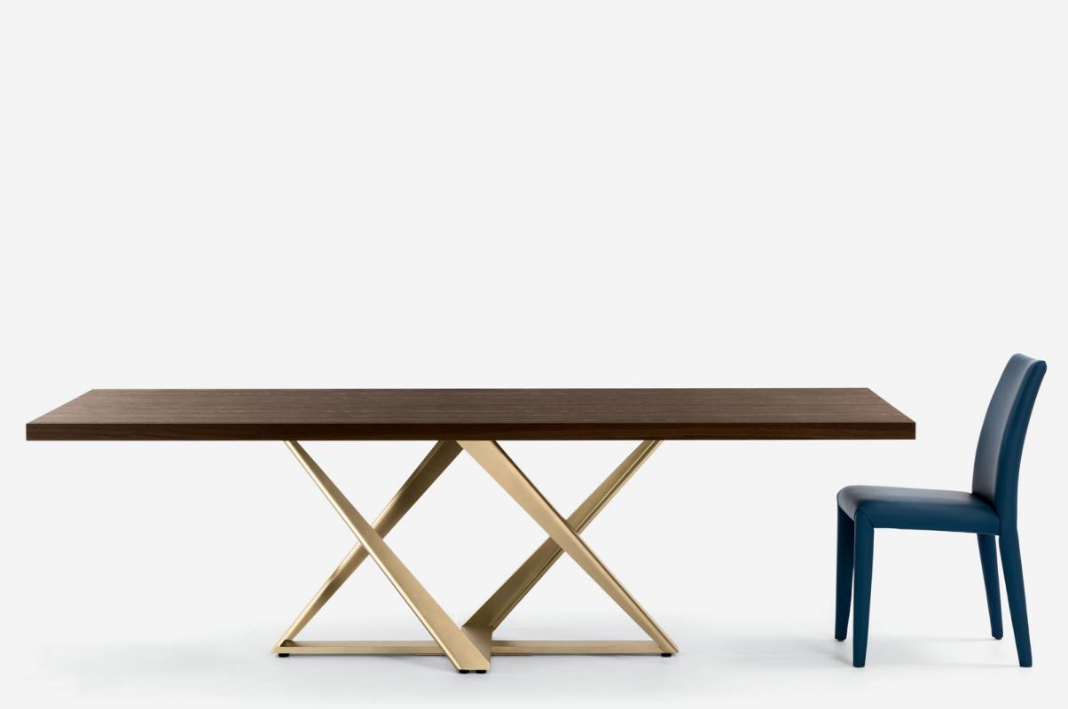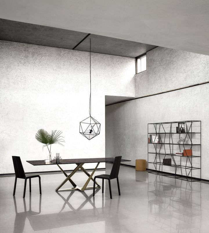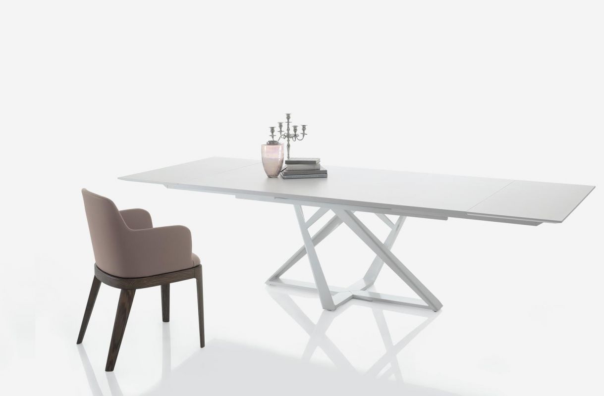 Table fix or with extensions, with lacquered Metal frame. Top in solid Wood, heritage walnut solid Wood, veneer with edge in solid Wood, veneer, lacquered Wood, glossy Glass, velvet matt Anti-scratch Glass, Superceramic or SuperMarble.