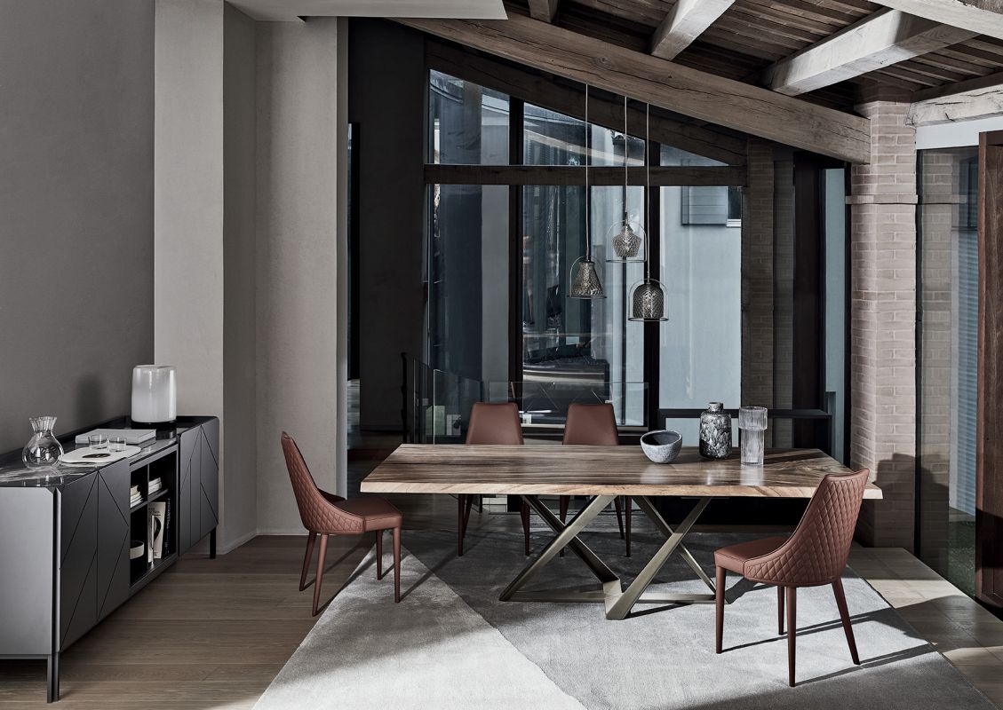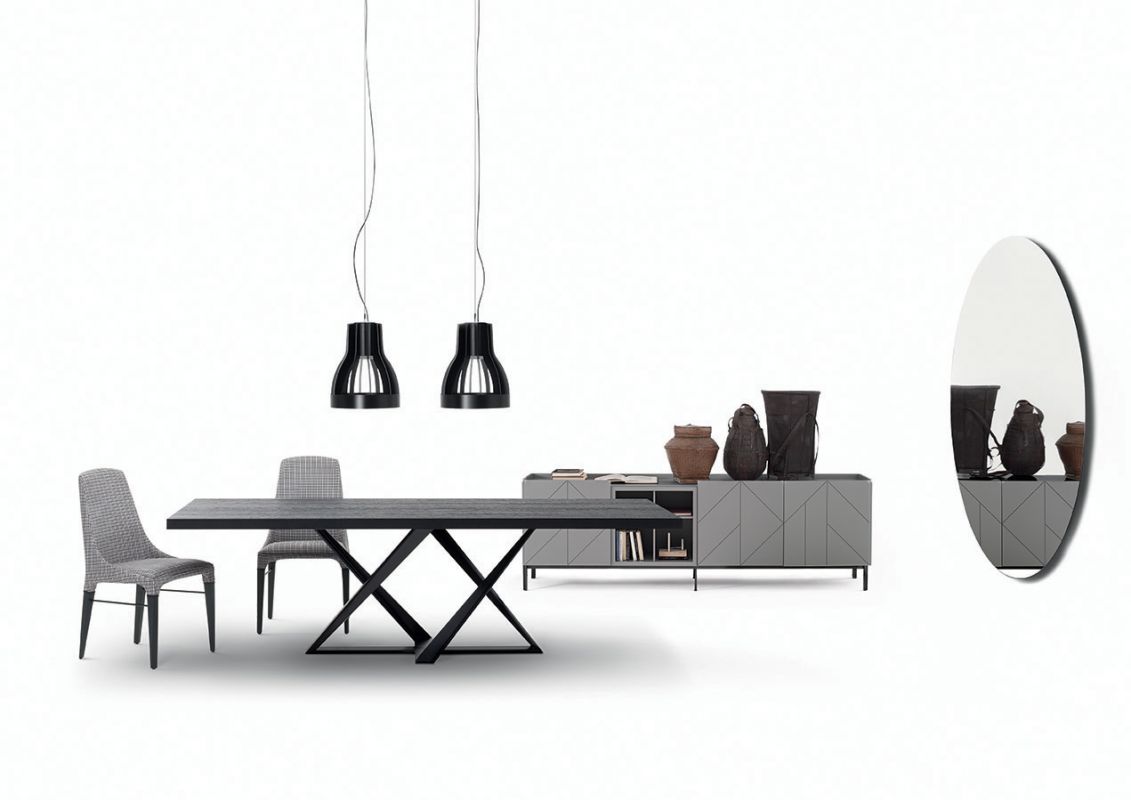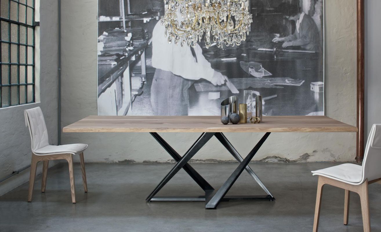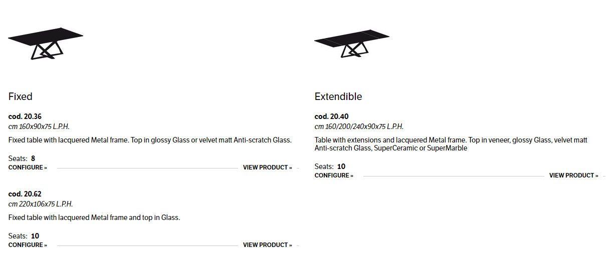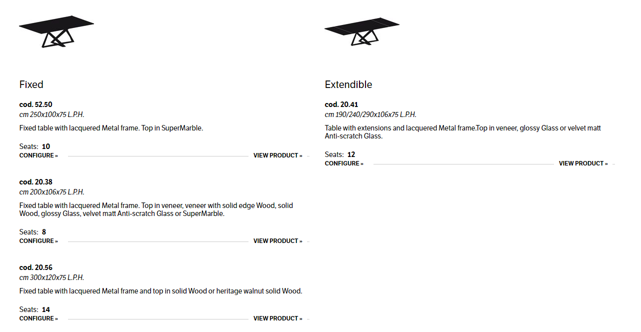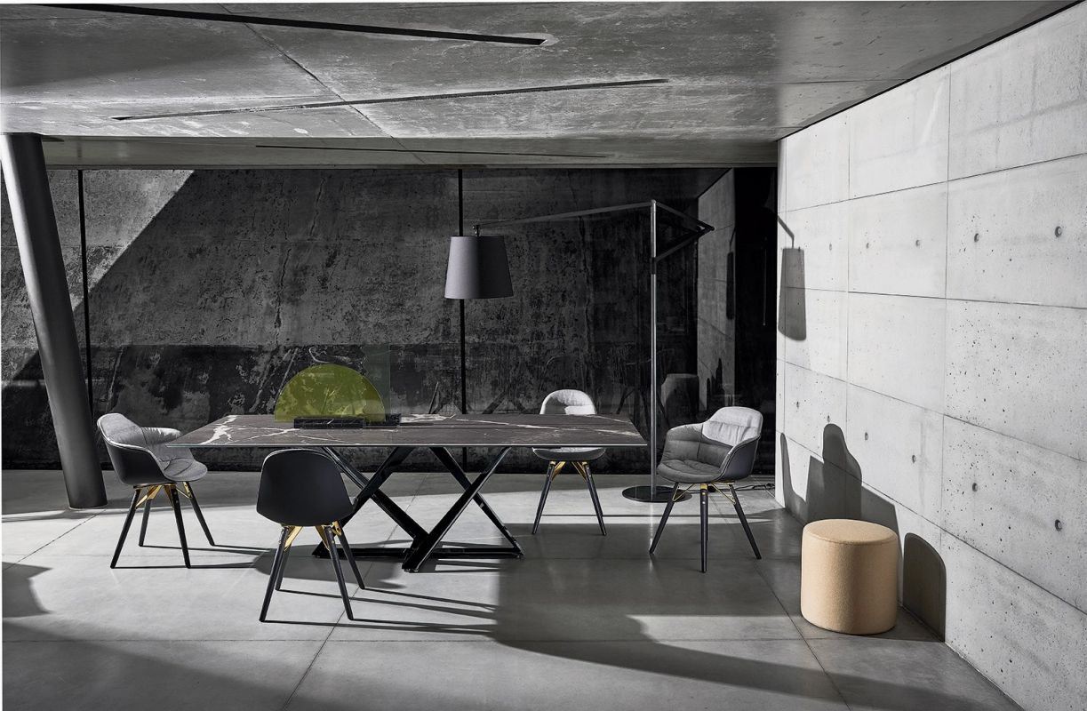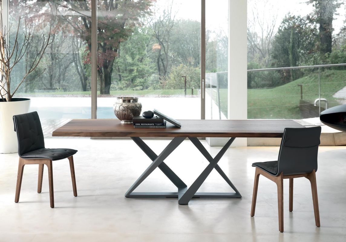 Table fix or with extensions, with lacquered Metal frame. Top in solid Wood, heritage walnut solid Wood, veneer with edge in solid Wood, veneer, lacquered Wood, glossy Glass, velvet matt Anti-scratch Glass, Superceramic or SuperMarble.