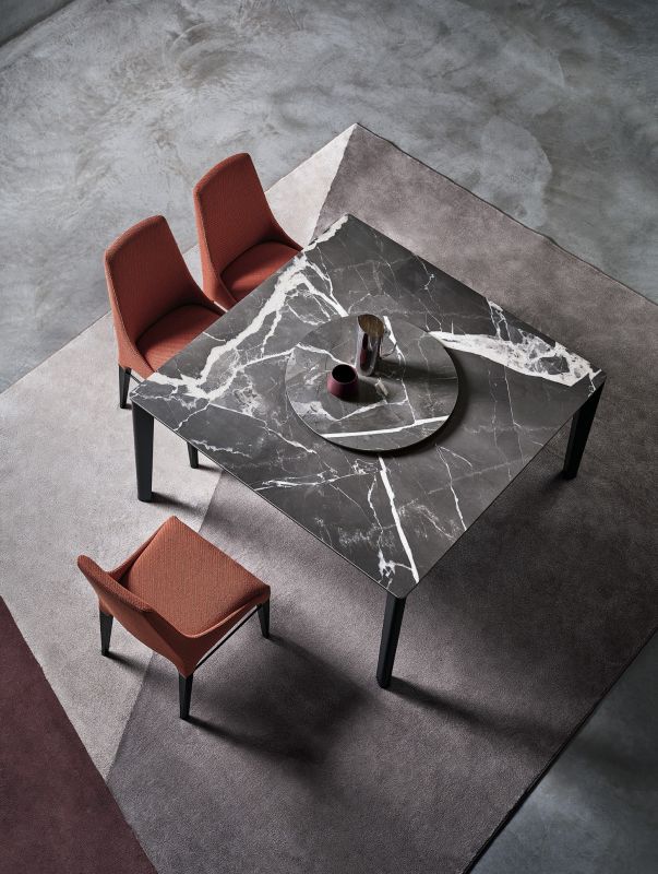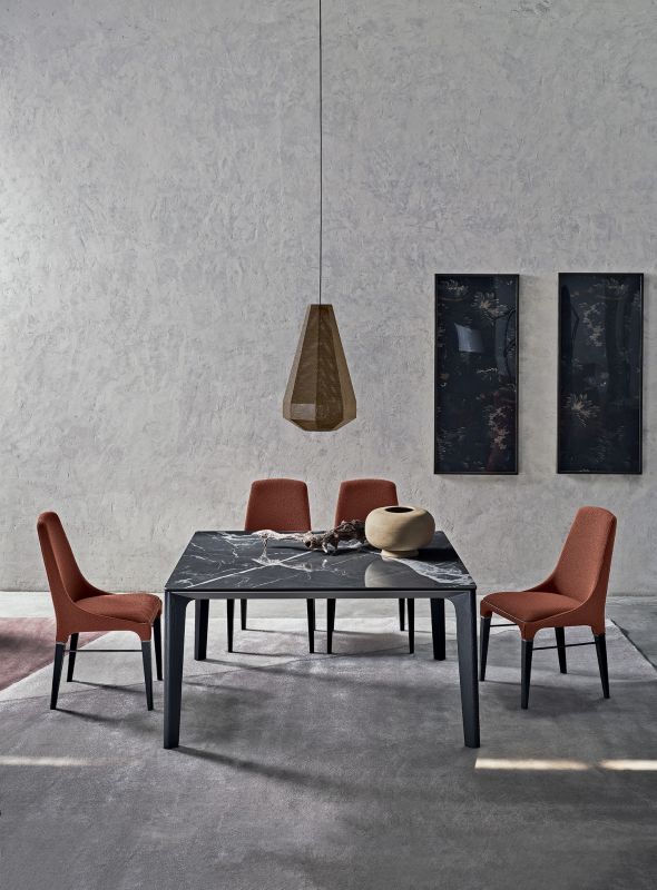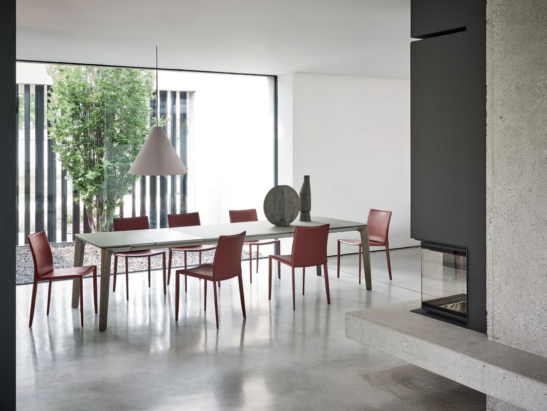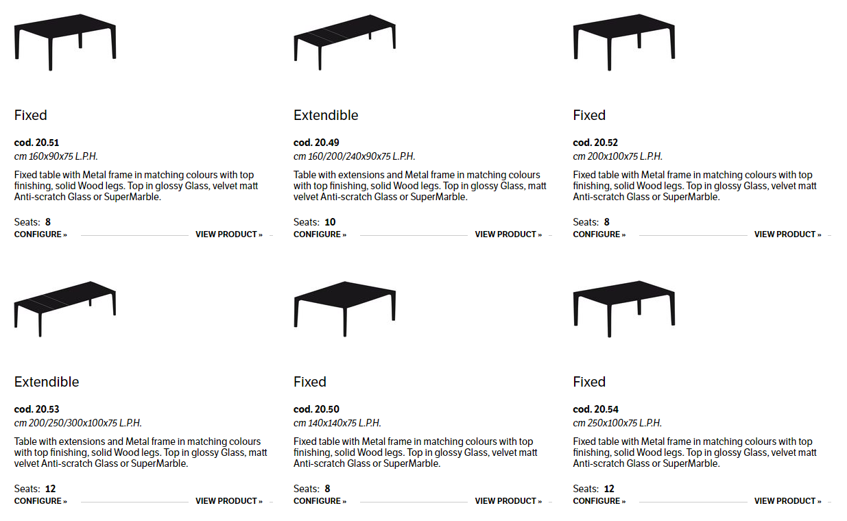 Table fix or with extensions with metal frame in matching colours with top finishing, solid wood legs. Top in lacquered wood, glossy glass and velvet matt anti-scratch glass.
