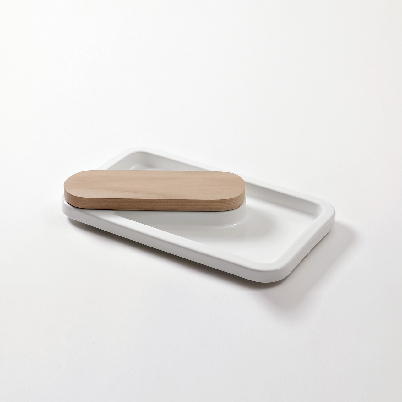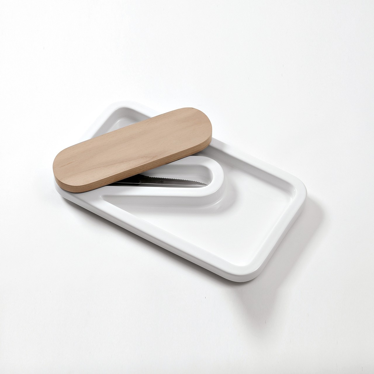 Elegante utensile da cucina dedicato al " pane e salame", uno dei piatti più diffusi e apprezzati in Italia. L'accostamento di ceramica del vassoio e legno del tagliere rendono questo oggetto pratico e raffinato.