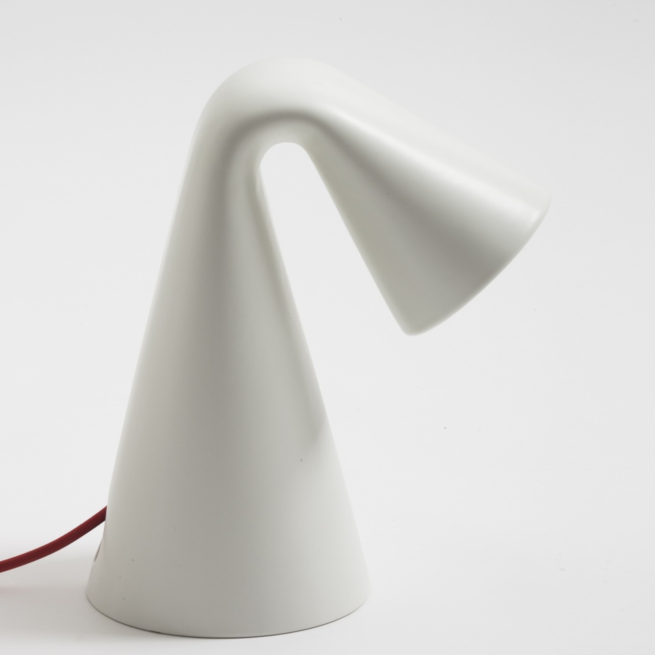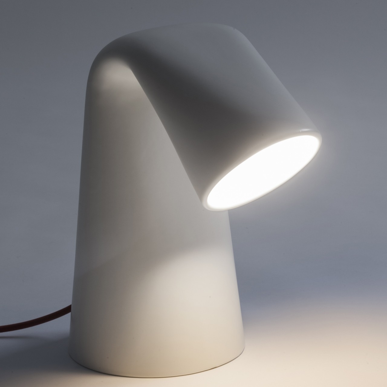 Con un inchino Kina saluta il sole al suo calare, proietta un cono di luce dal suo corpo fluido. Lampada da tavolo realizzata interamente in ceramica e disponibile in diverse tonalità di colore.