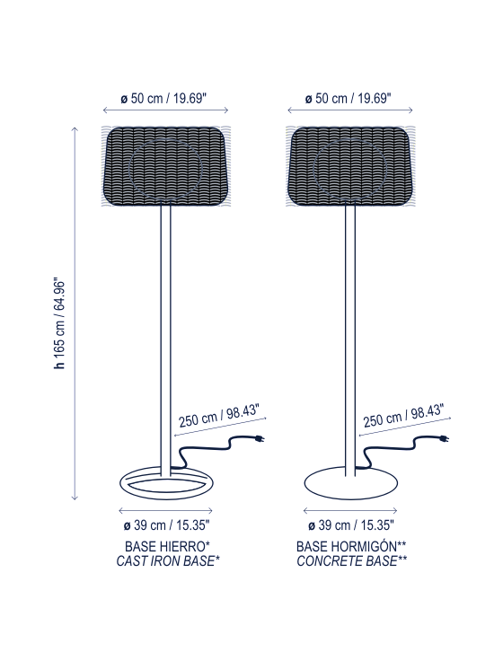 FORA is an outdoors lamp with IP-65. The cast iron base is distinguished by a radial base whose tubular desing improves durability and allows light to reach the grass. Light source is protected by an elliptical medium intensity and U.V. protection polythene globe, which guarantees a water tight electrical fixture. The shade is made of synthetic wicker, making it highly resistant to weathering while casting a pleasant, diffuse light. The result is a luminaire that adapts well to all types of indoor and outdoor environments. Its versatility is remarkable and difficult to find in products of this category. This family consists of a table lamp, floor lamp, ceiling, pendant retail and pendant big format.