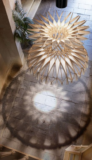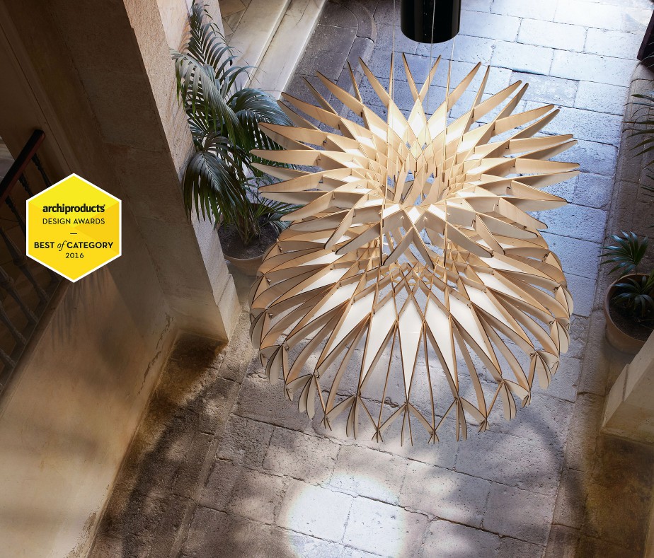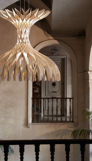 The integration of design, art and light in architecture dates back to a long time ago, and maybe this is the reason why lamps have gradually stop being just an item emitting light to become a light sculpture which confers a special personality to the product and its environment. It is such the importance of light that any change on the item can alter the formal concept of the whole project. A sculpture may seem more or less static, depending on the light received. With DOME we decided to take the light out of the object so it becomes a light sculpture designed to receive and emit a delicate light, a play of shadows and nuances that enrich the space for which they were created. Developing this project with Benedetta has allowed us to reflect on the art of lighting, on how to reinterpret light and on the creation of products with a more artistic approach and a less industrial look. It has also allowed us to be swept away and do what we really like to do. These light sculptures are completely handmade and they are entirely produced in the Bover Barcelona HQ. More than 170 big and small wood fragments are wisely intertwined and sewed one by one to end up in such a jigsaw puzzle.
