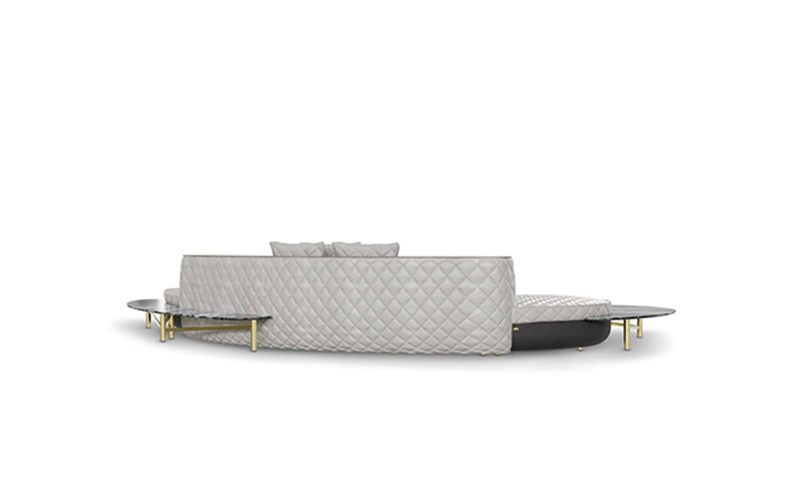 Senzu is a brand-new upholstery piece designed to epitomize the ultimate expression of comfort, functionality, and luxury. This modern sofa made of leather highlights a rounder form with a neutral color scheme. In one of its extremities, Senzu presents an integrated side table completed with a Kenya black marble top and a stainless steel base that grants a new dimension to the concept of the living room sofa.