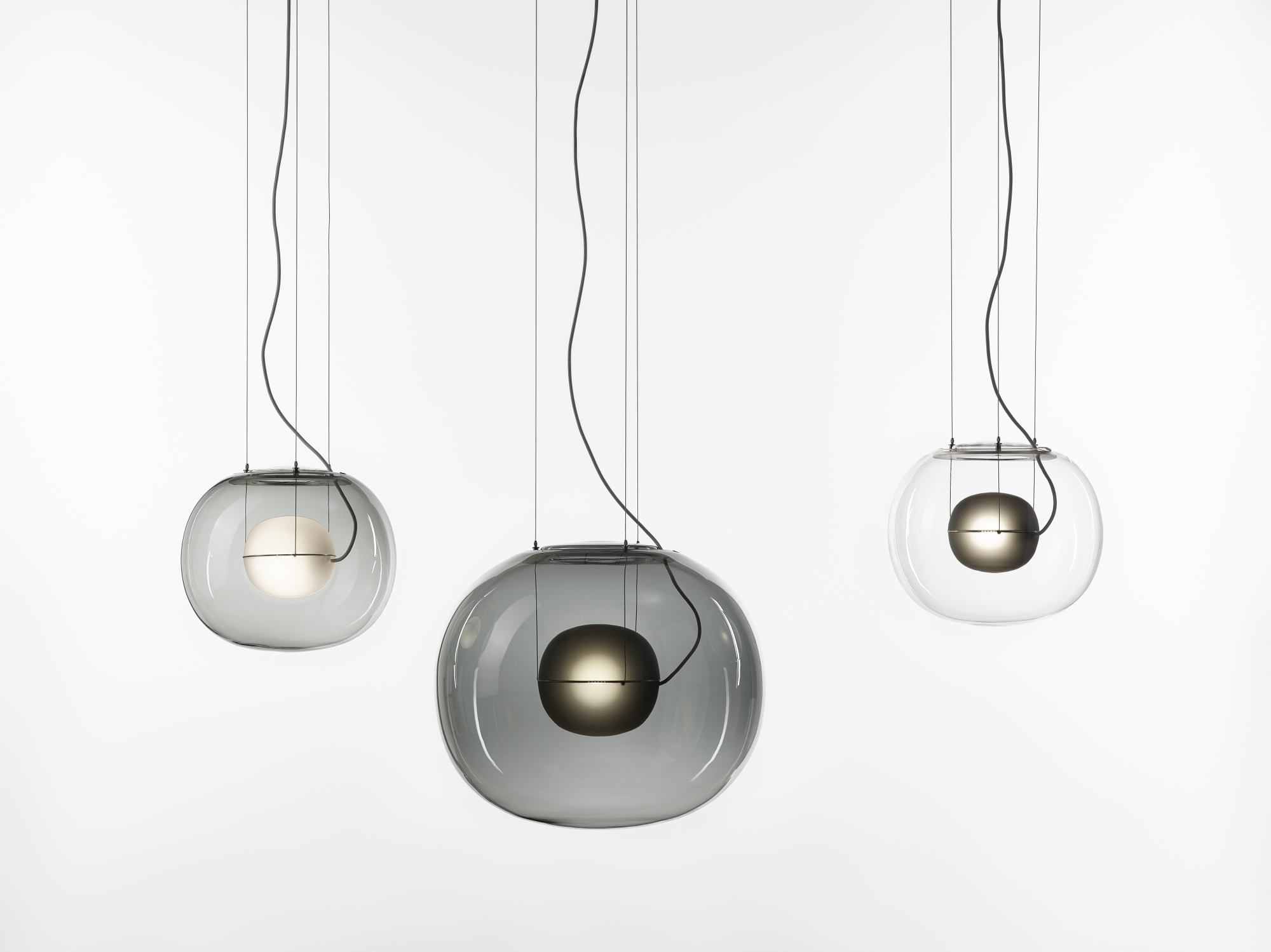 The sophisticated design of a bubble suspended in the centre of a large sphere evokes a sense of levitation. Outer glass available with glossy finish in colours: transparent and smoke grey transparent. The inner glass comes in matte finish in colours: triplex opal, smoke grey transparent, red transparent and light pink transparent. Big One collection is available in two sizes.