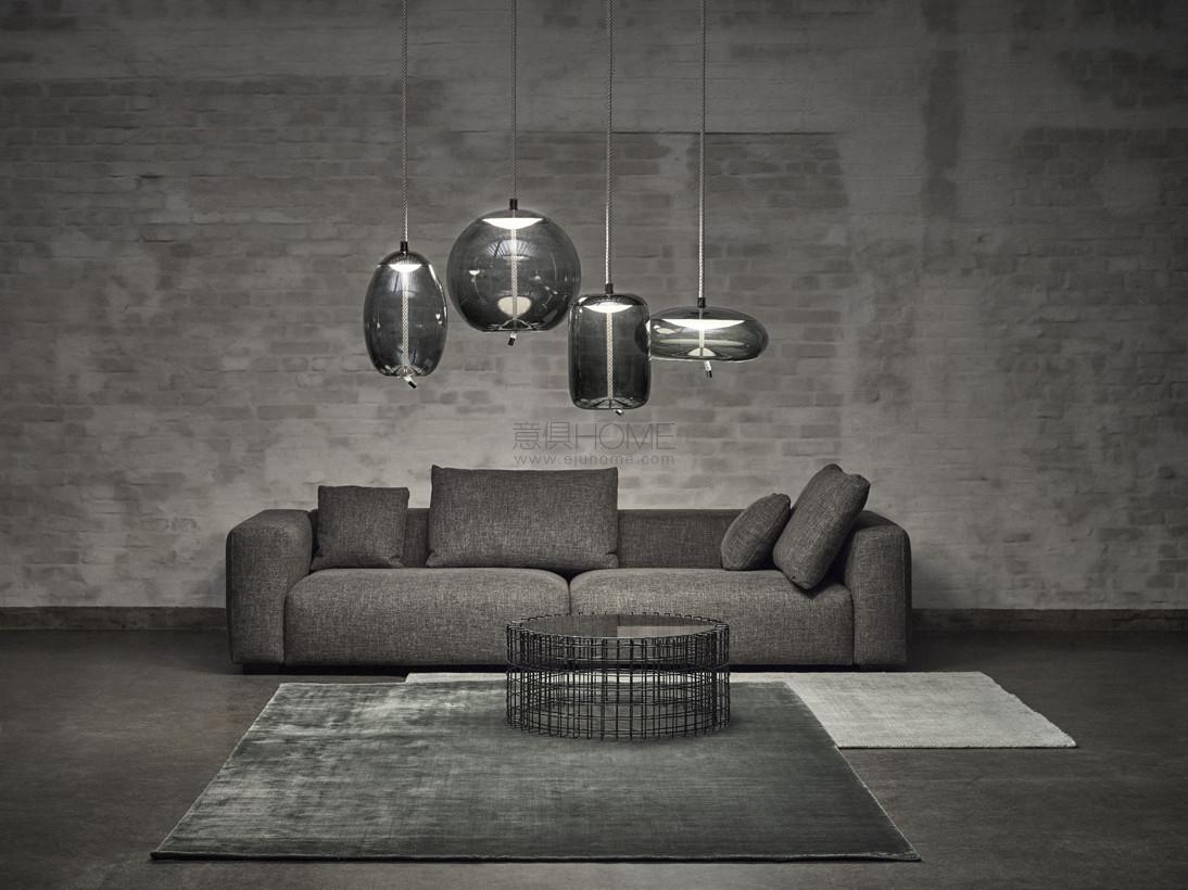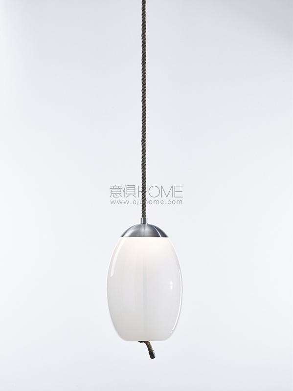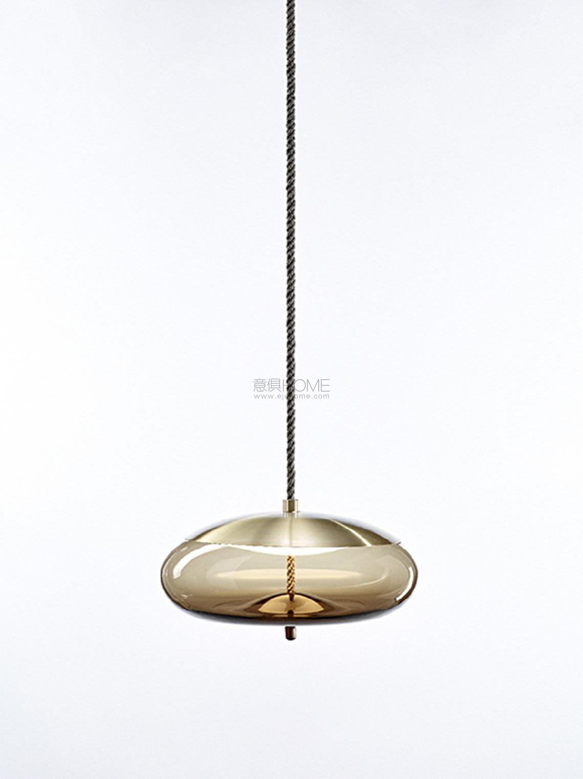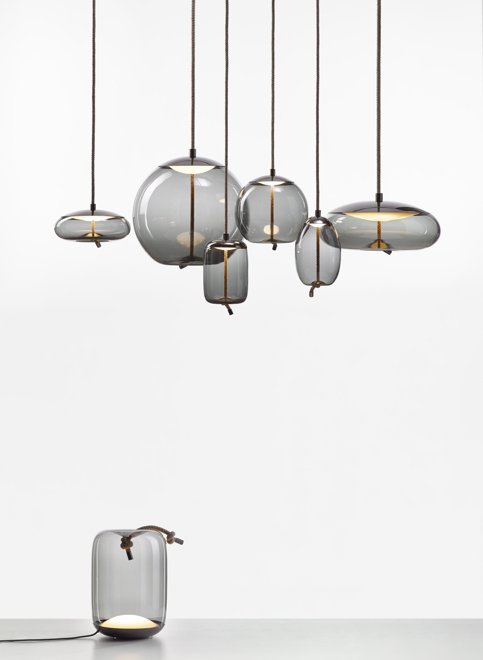 Full-bodied globes of varying shapes and sizes are penetrated by robust cords that seemingly pull the bottom of the glass inward for a bemusing plastic effect. The LED light source is housed in a handsome top hood, which, like the cord end cap, is fashioned in refined metal. The collection comprises four pendant lights of different shapes available in two sizes.