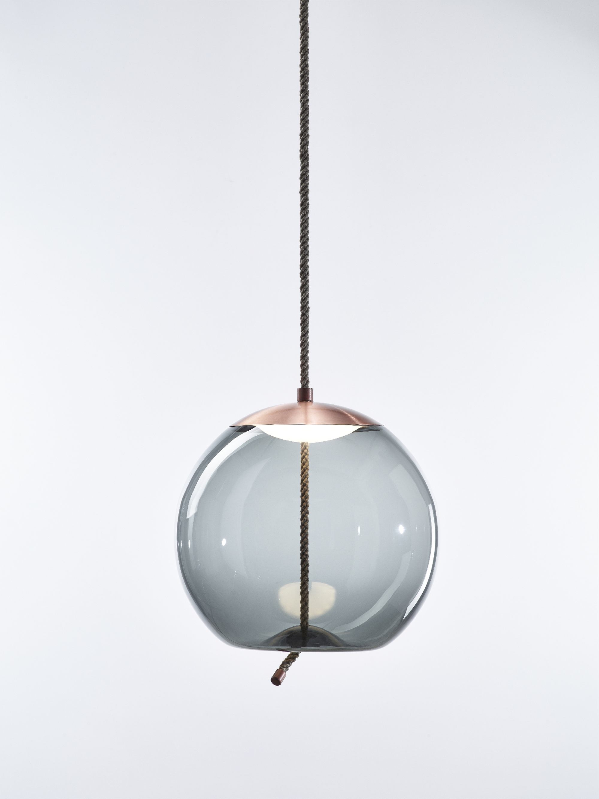 Knot is a collection of stately pendant lights that appose two dramatically dissimilar materials. The design combines coarse natural fibre with smooth, transparent blown glass to arouse a contrast as striking as it is dignified.