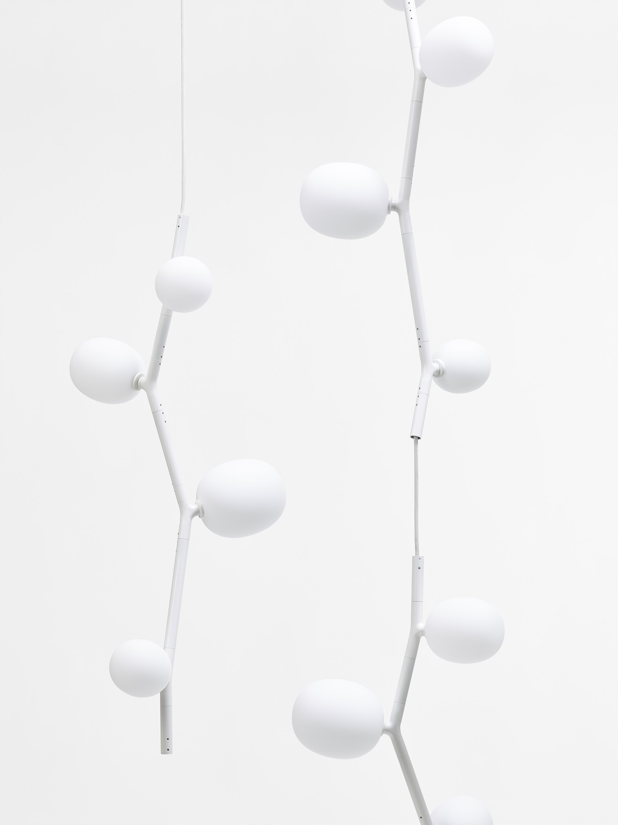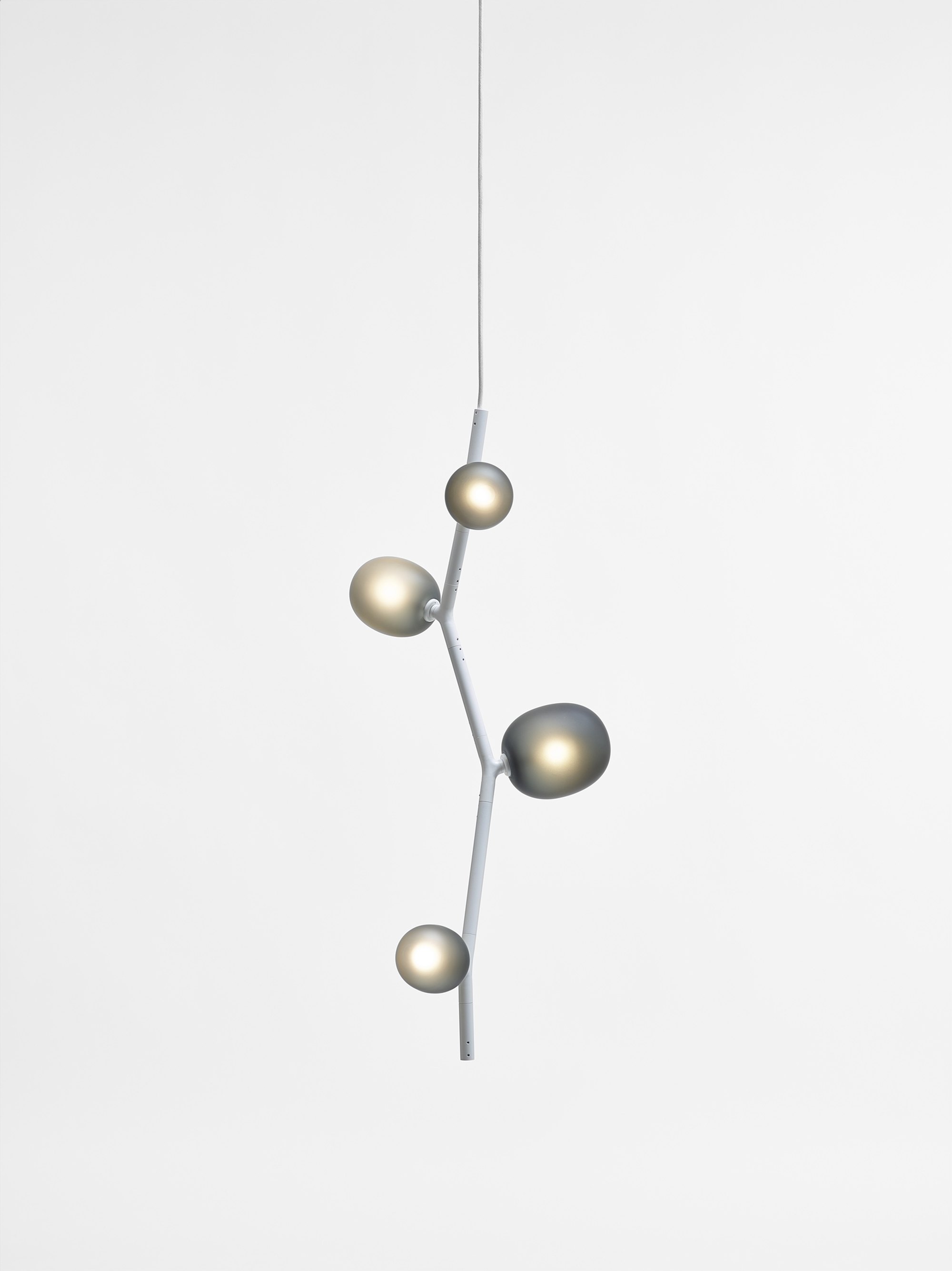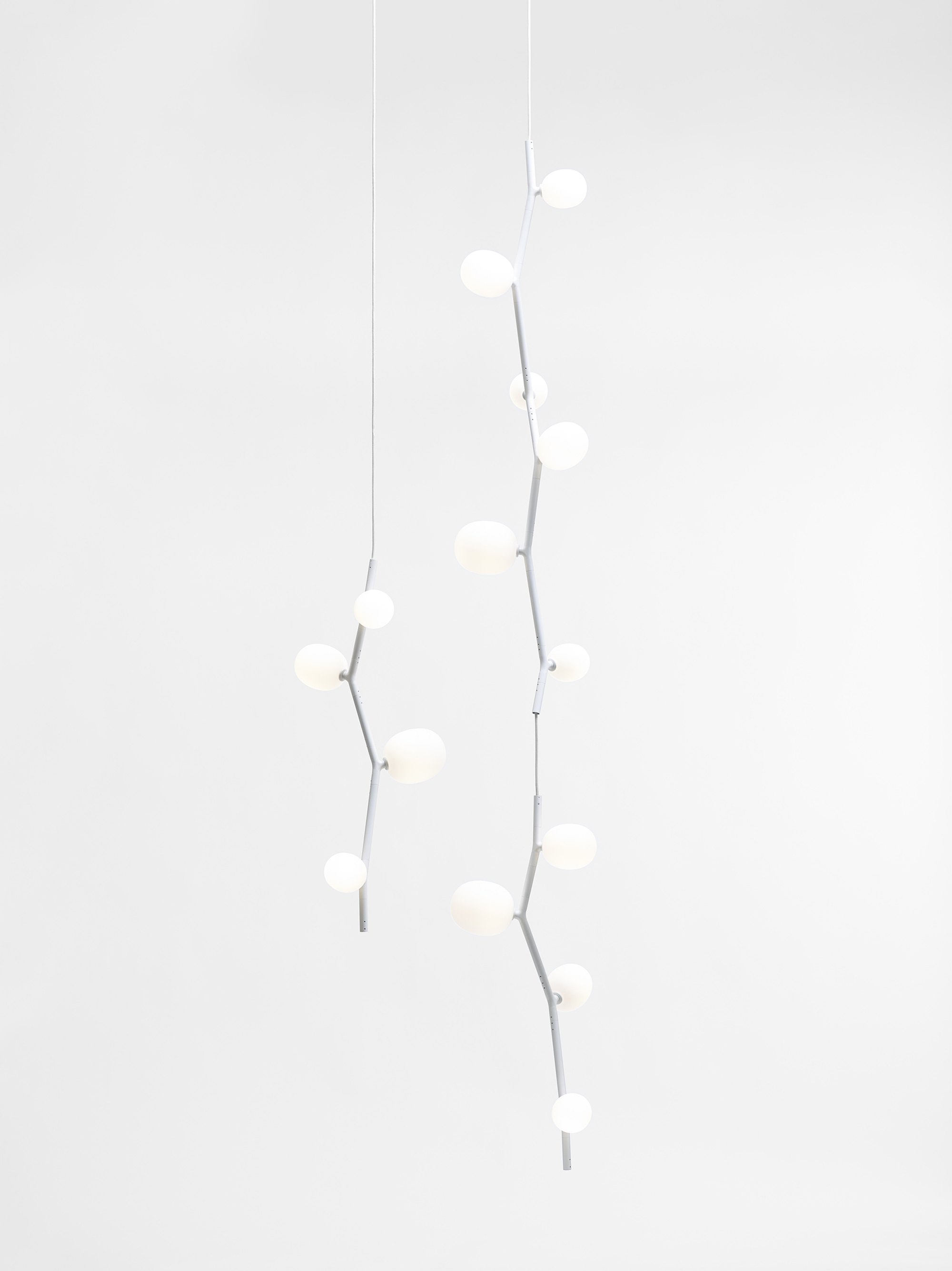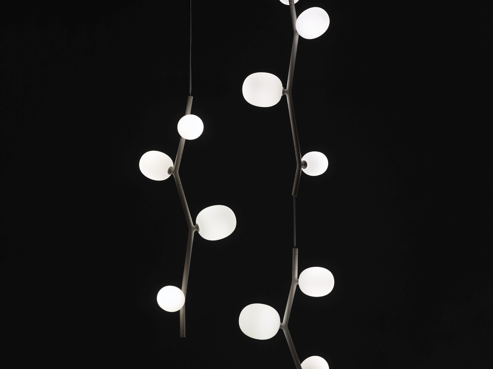 The collection features three sizes in opal or smoke glass. Variable, elegant, and precise in workmanship all the way down to the smallest detail, IVY is a high-tech lighting concept well suited to both commercial and residential applications. In intimate home settings, for example, a single elegant branch can be used, or multiple branches can be joined together to create a curtain of light. IVY has many forms and justly takes its place among artistic, so-called bespoke, lighting installations.