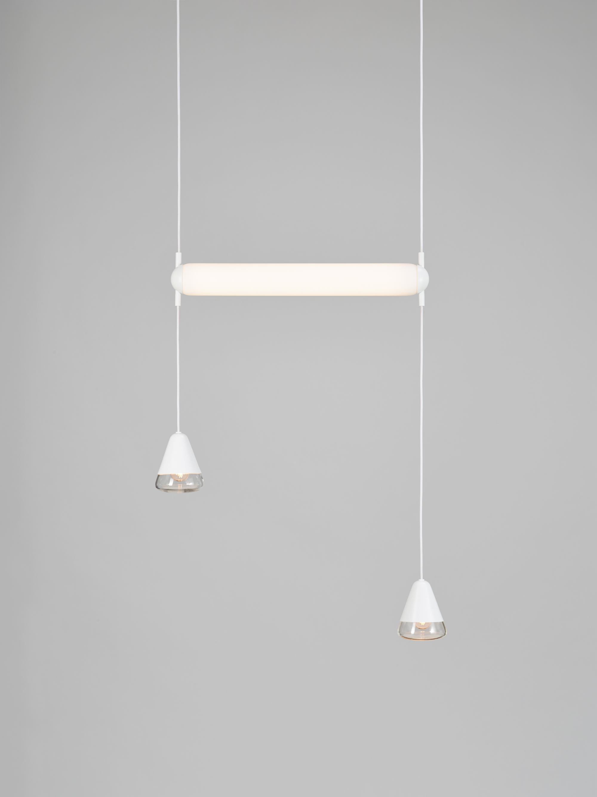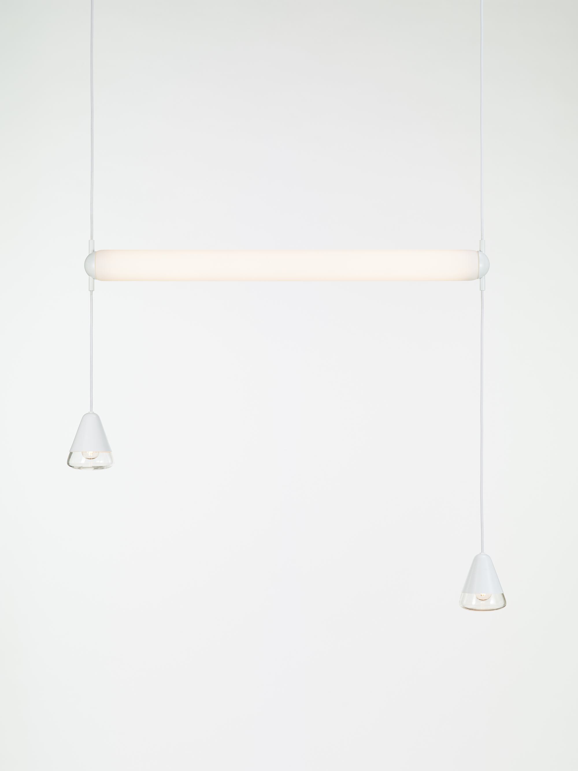 Puro is a boldly minimalistic variation on atmospheric pendant lights. Inspiration for the collection and its name come from the Spanish word for “cigar”, which also means “puro” and is a reference to the composition’s clean lines. The design creates an intriguing interplay between horizontal and vertical luminous cigar tubes levitating in space above simple bell lights. The diffused glow of the tubes combines with that of the bells to elicit a dynamic ambience, while the alternating gloss and matte finishes provide a degree of provocation.
