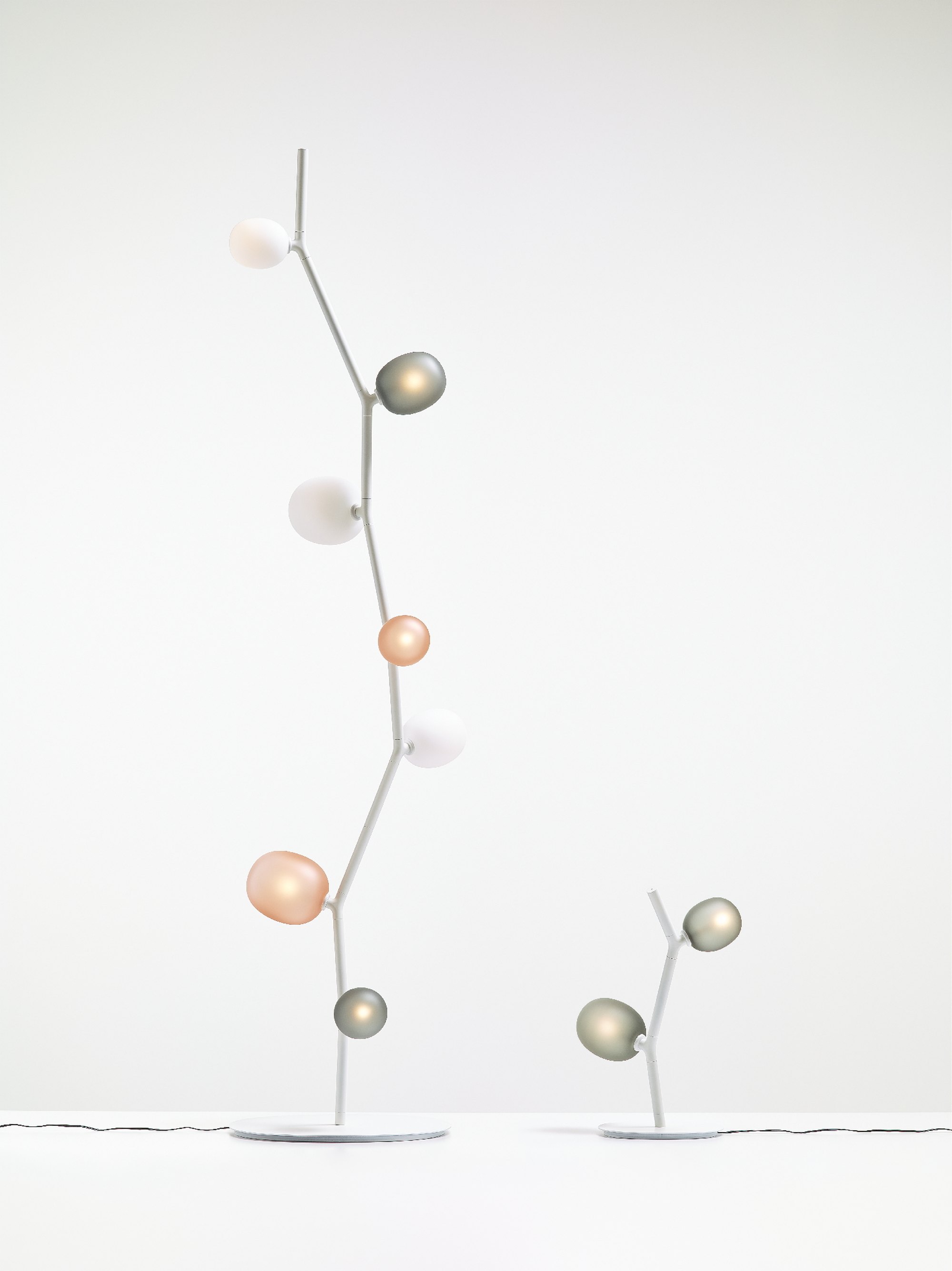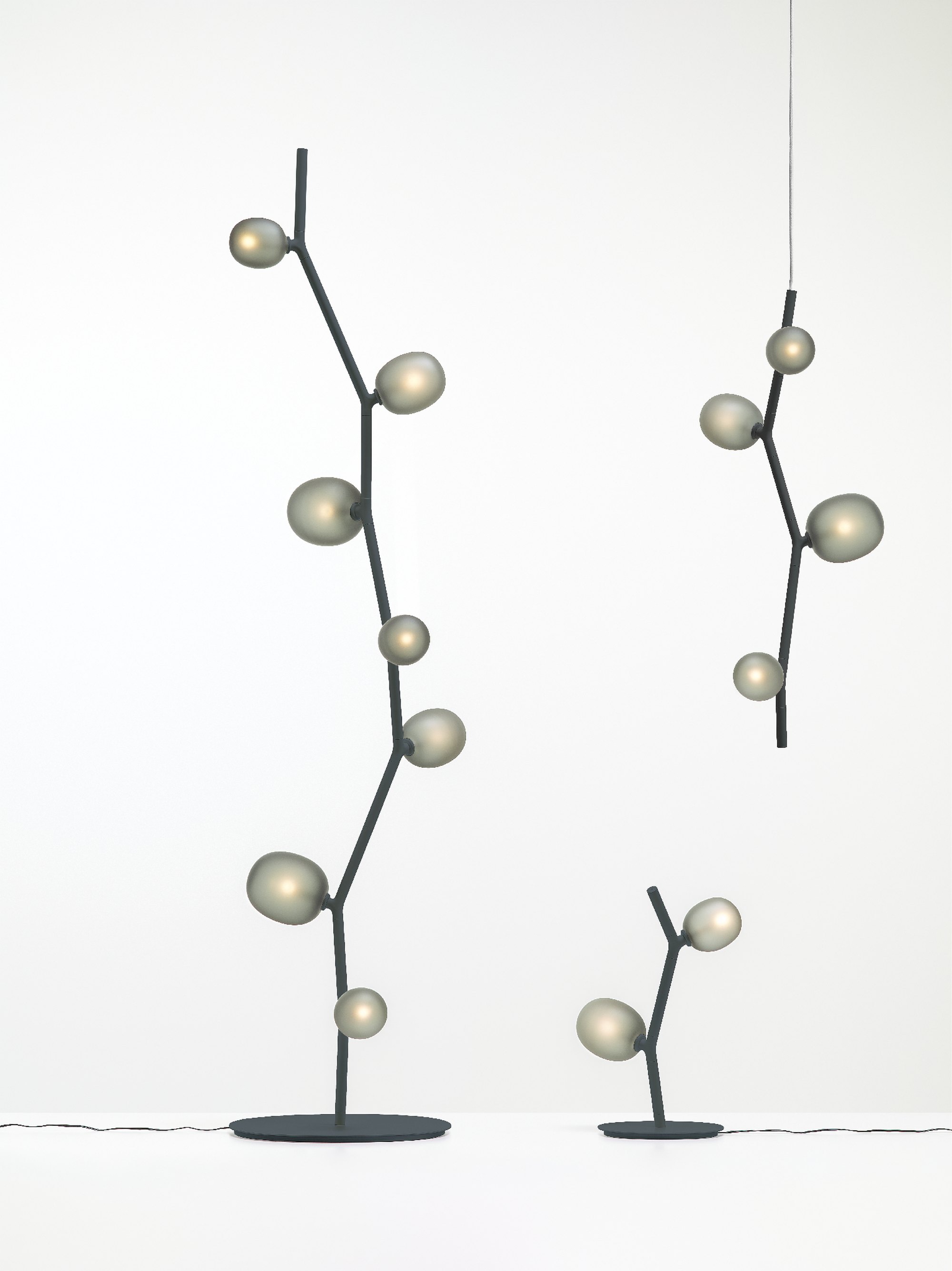 The collection features three sizes in opal or smoke glass. Variable, elegant, and precise in workmanship all the way down to the smallest detail, IVY is a high-tech lighting concept well suited to both commercial and residential applications. In intimate home settings, for example, a single elegant branch can be used, or multiple branches can be joined together to create a curtain of light. IVY has many forms and justly takes its place among artistic, so-called bespoke, lighting installations.