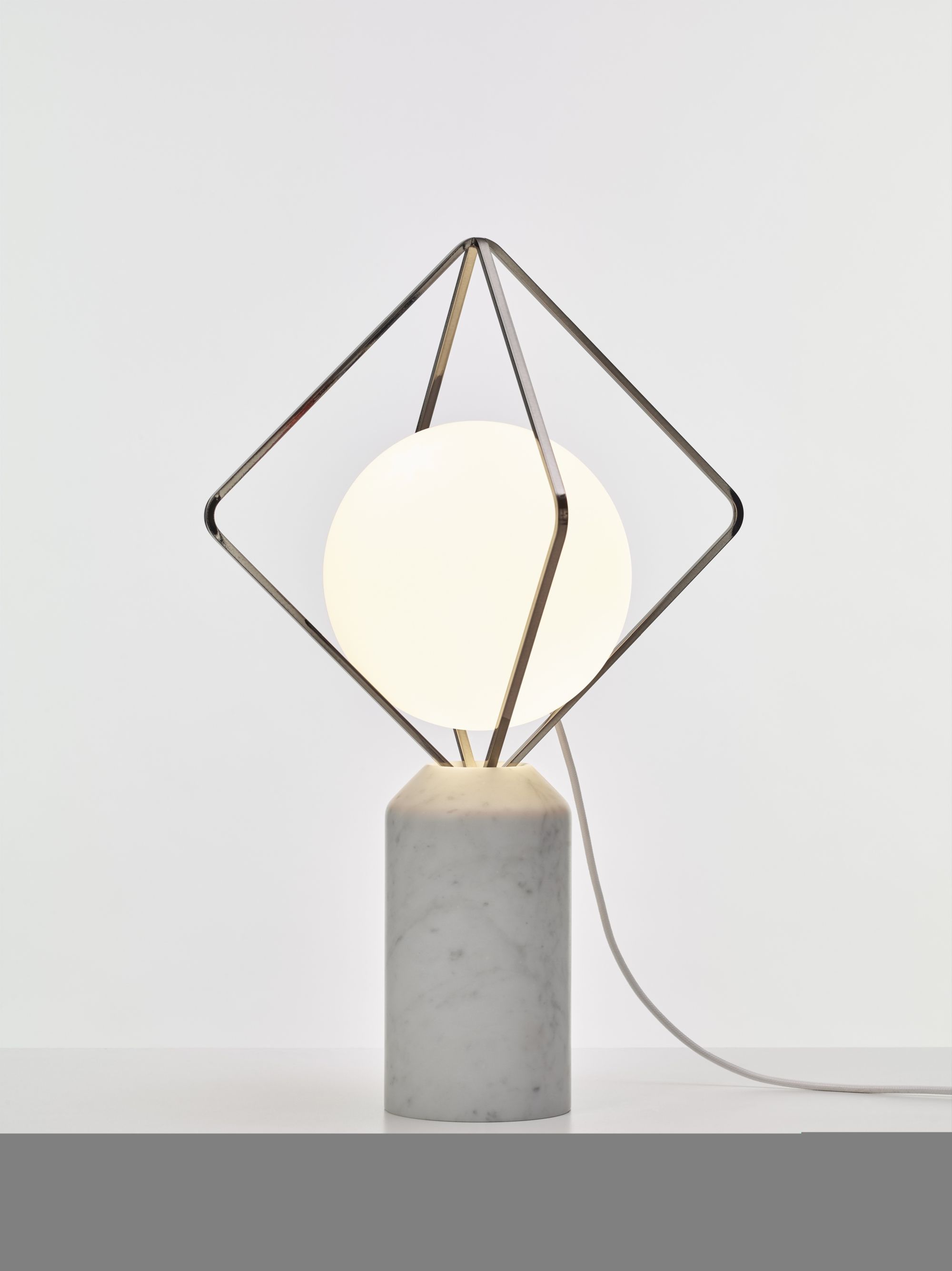 This modern lighting element with marble base, metal frames and a “pearl” placed inside, designed by Lucie Koldova, rounds out the variable Jack O’Lantern family. The new table version combines the beauty of handblown acid etched glass in smoke grey, light pink or triplex opal colours with marble base Carrara or Satinated nero marquinia, in frames with copper, chrome or chrome black liquid metal coating.