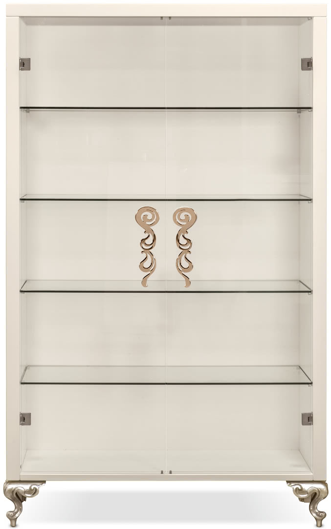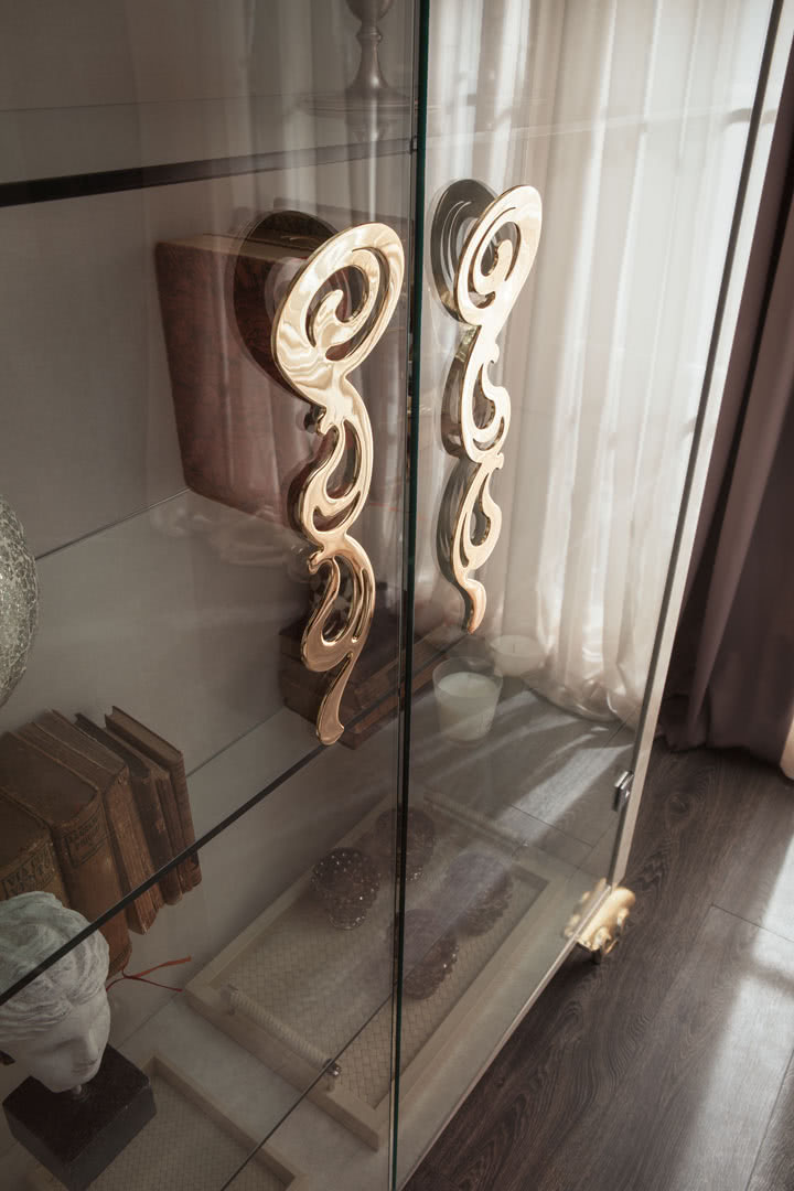Ripiani interni in vetro molato a filo lucido. Dalla linea pulita e rigorosa del mobile risaltano i piedi, in alluminio pressofuso e decorato in foglia, e le maniglie, in ferro tagliato a laser, curvate e levigate artigianalmente in galvanica.