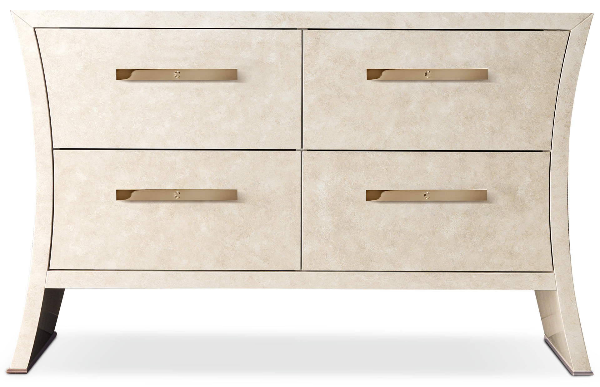La struttura, in legno curvato e sagomato, è realizzata in madreperla spatolato o nella nuova finitura seashell, che dona luminosità alla struttura dalle forme sinuose. I quattro cassetti presentano delle maniglie tagliate a laser in oro pallido; la base è disponibile in bronzo. Il comò Richard New, insieme ai comodini, crea un gruppo notte elegante e unico.
