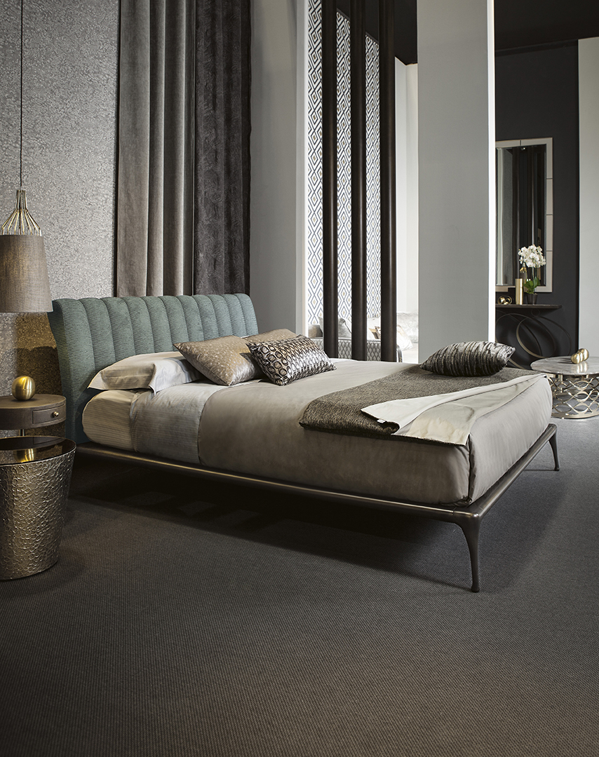 La struttura perimetrale e i piedi sono in fusione di alluminio, decorati in bronzo; la testata imbottita, con trapuntatura verticale, è rivestita con velluto, tessuto, pelle, ecopelle o con tessuto/pelle fornito dal cliente. Un’aura vintage che rende accogliente l’intera camera da letto. Il letto Iseo è disponibile in varie dimensioni per reti da cm: 120x200 (letto da una piazza e mezzo), 140x200 (letto alla francese) e 160x200 (letto matrimoniale).