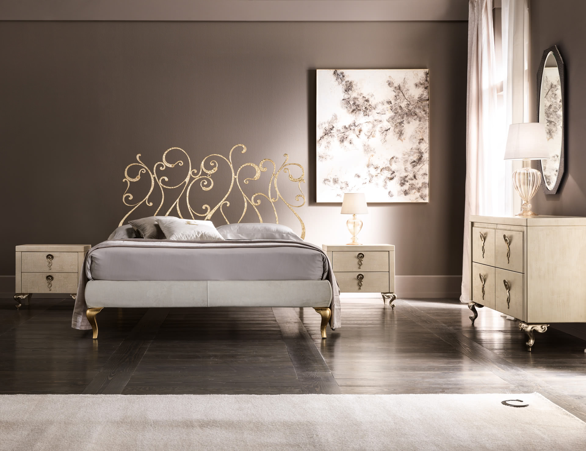 La testata è realizzata in ferro, battuto e forgiato a mano con finitura in foglia argento champagne applicata a mano. Il giroletto, con struttura perimetrale in legno e piedi in fusione di alluminio, è rivestito in ecopelle o con un tessuto fornito dal cliente. Il letto Klimt è perfetto per una camera dal design classico e decorativo; è disponibile in varie dimensioni per reti da cm: 160x200 (letto matrimoniale), 180x200 (letto matrimoniale) e 200x200 (letto king size) anche nella versione con box contenitore.