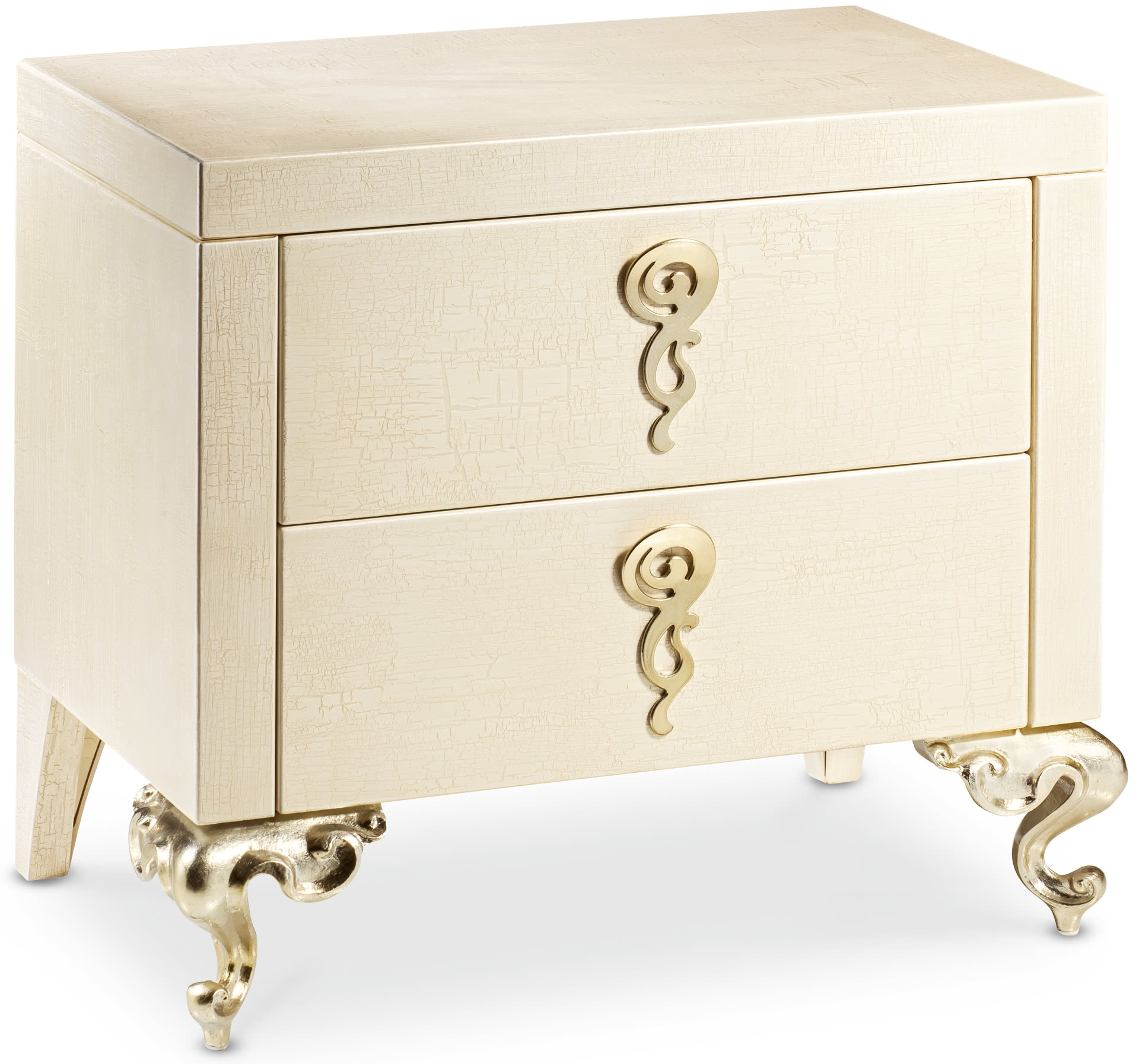 La struttura è realizzata in legno bugnato con forma squadrata; i cassetti, con guide ad estrazione totale e richiamo frenato, sono decorati a mano in madreperla anticato o spatolato. Le maniglie, in metallo tagliato a laser, sono finite in oro mentre i piedi, in fusione, sono decorati a mano in foglia argento champagne. I comodini George, insieme al comò, creano un gruppo notte perfetto per una camera da letto raffinata e dal design classico.