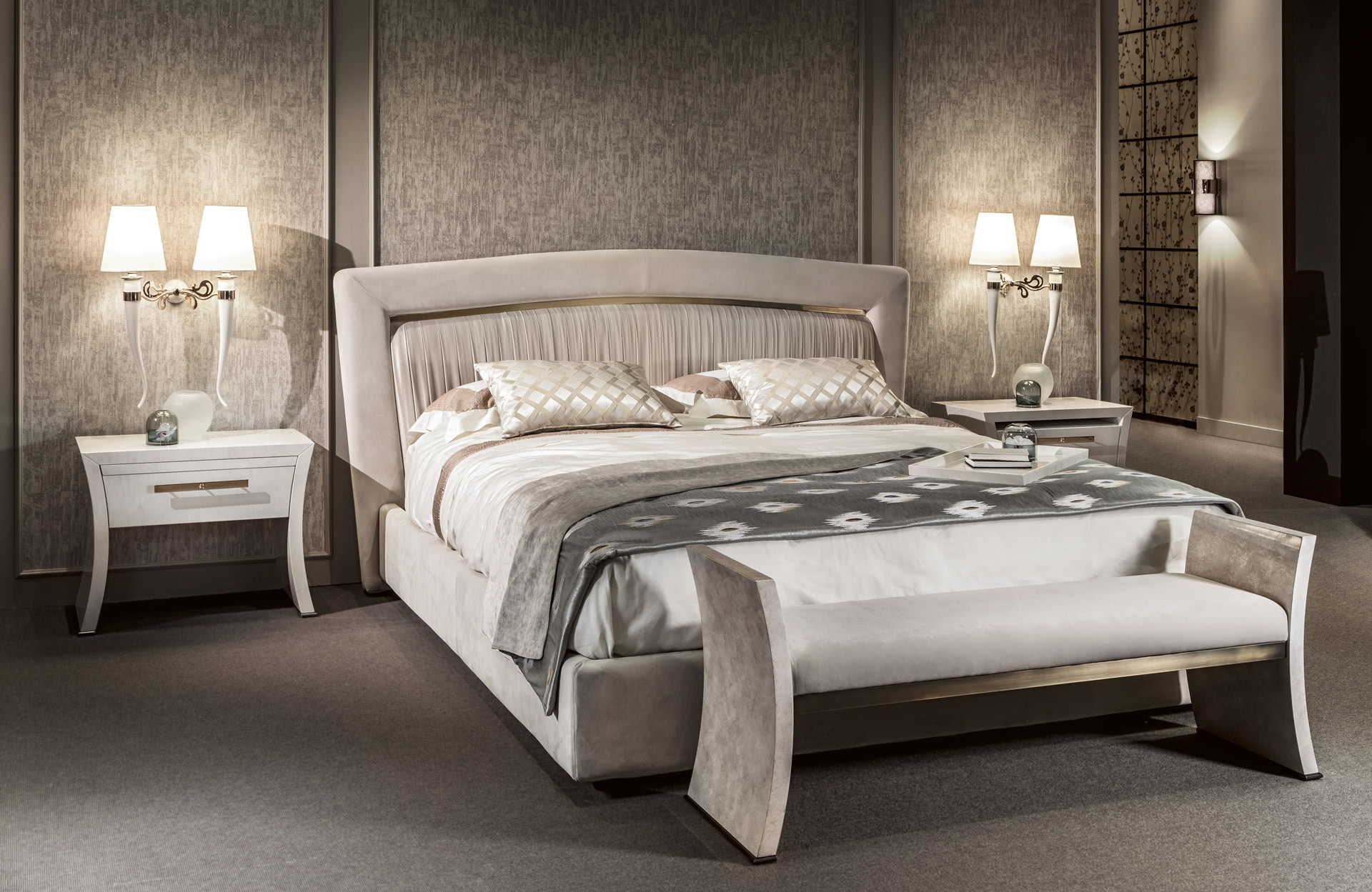 La struttura è in legno curvato mentre i piedi e la fascia sotto la seduta, sono in ferro con finitura a bagno di galvanica bronzo. La seduta, in ferro imbottita in gomma, è rivestita e trapuntata in velluto, tessuto, pelle o con un tessuto/pelle fornito dal cliente. Perfetta come fondo letto in camera.