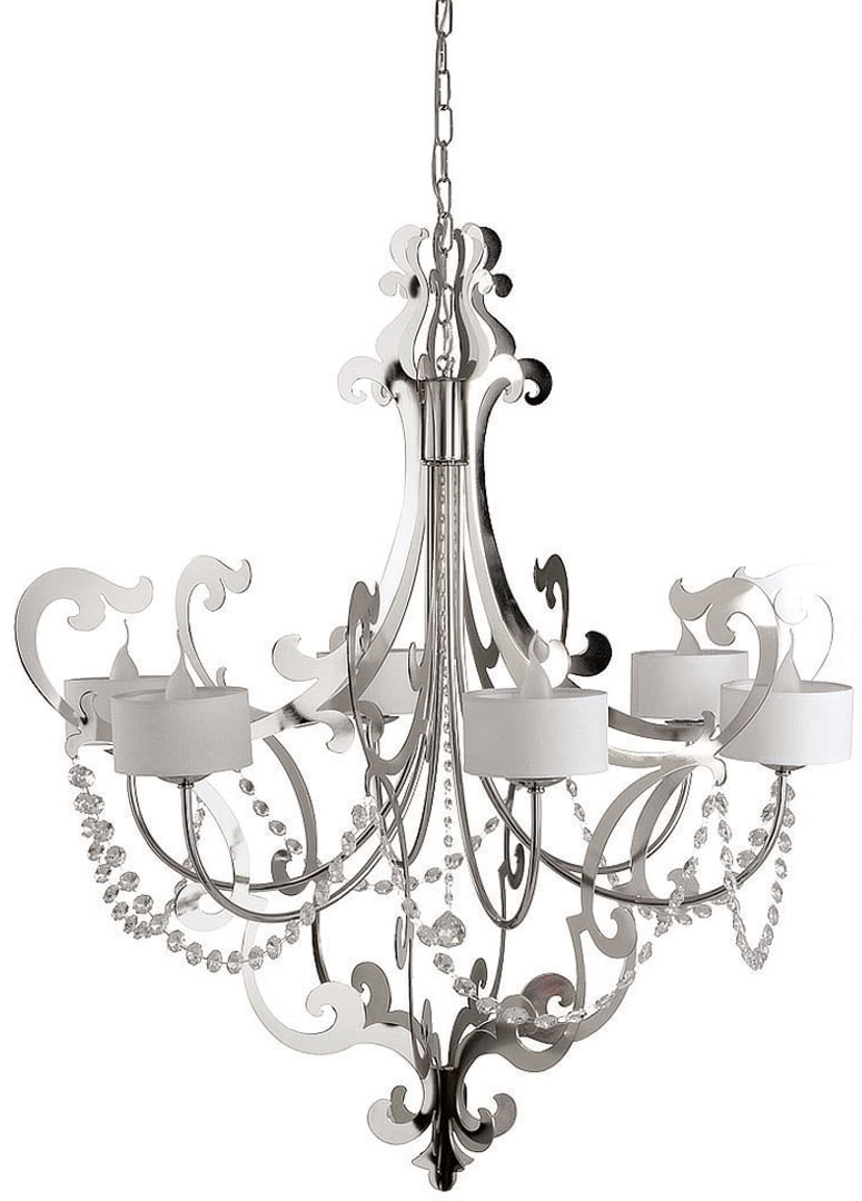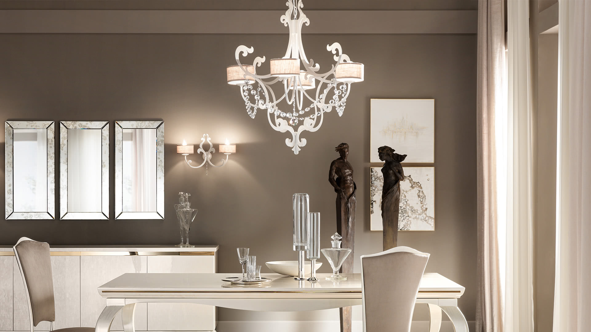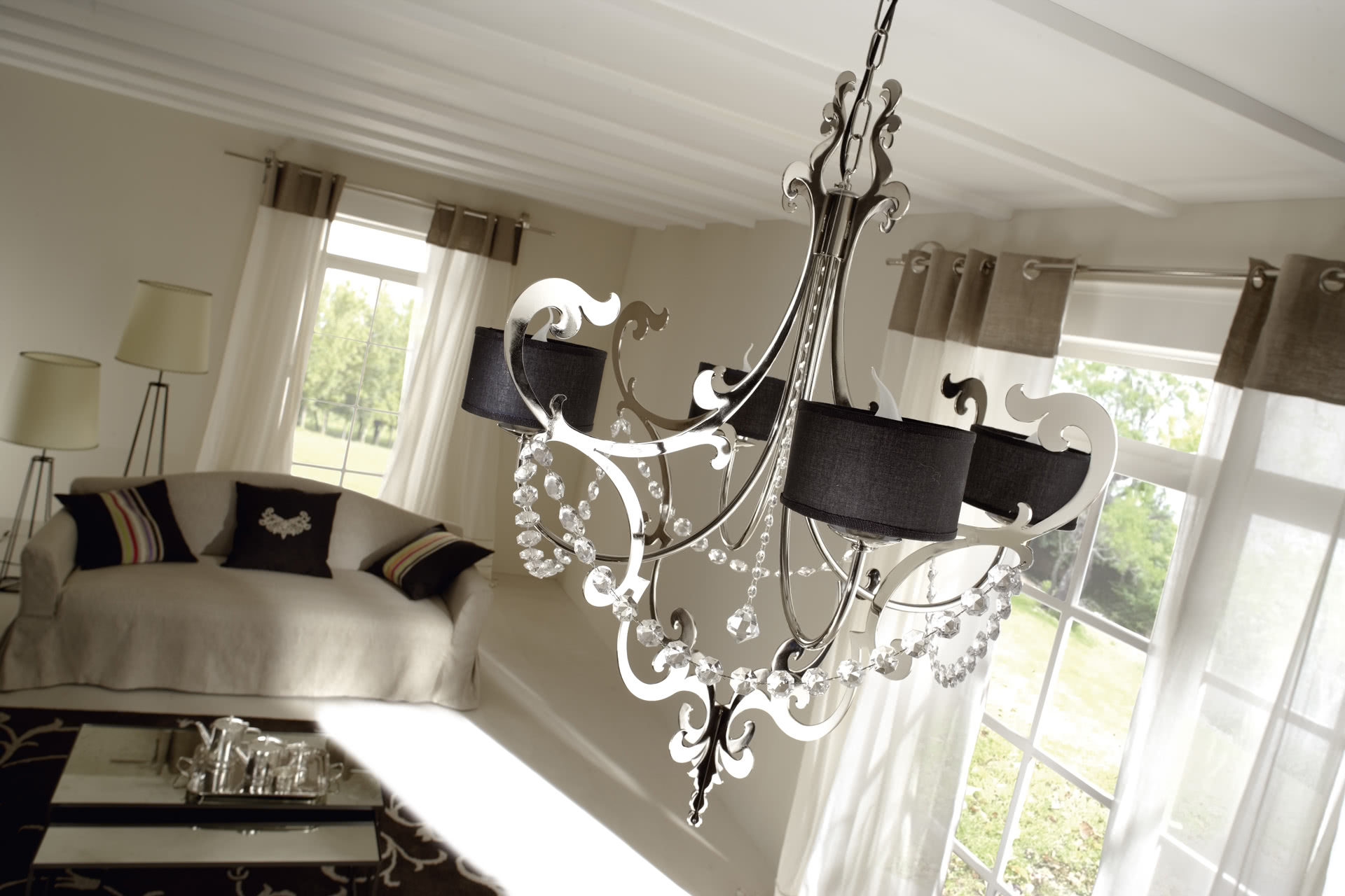 Lampadario a sospensione classico Iago con 4 o 6 bracci, impreziosito da fili di vetro.