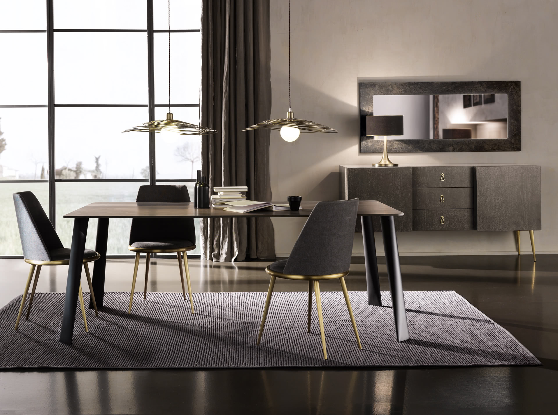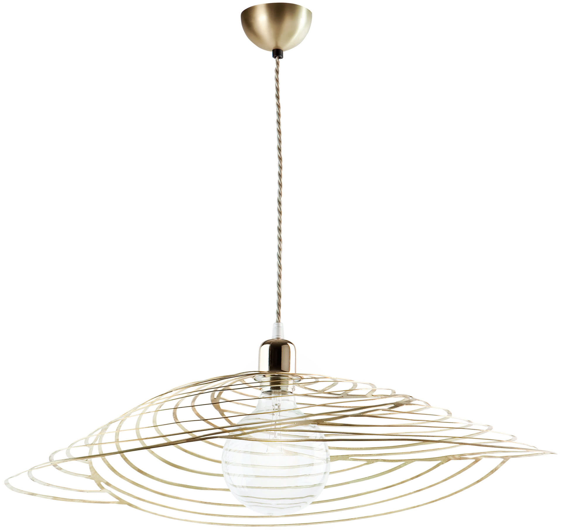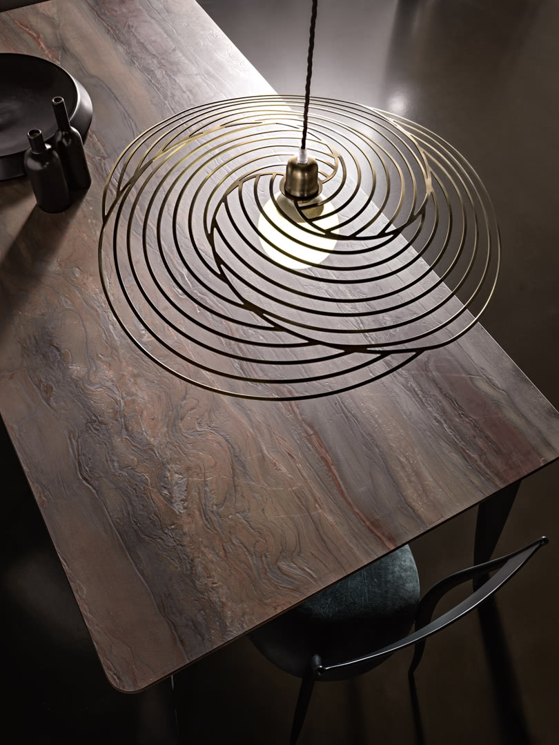 Da un solo foglio di metallo, seguendo il disegno del progettista, il laser ritaglia le spirali del lampadario; il pezzo viene curvato, sagomato e finito in ottone spazzolato. Con la luce accesa, le dinamiche volute, dal design industriale, saranno proiettate sul soffitto.
