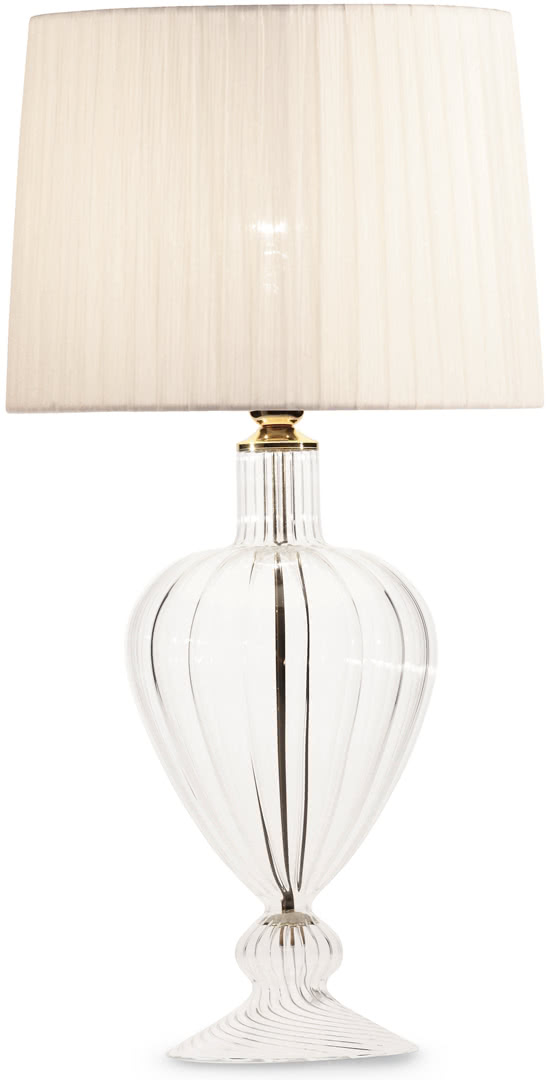 La base in vetro boro silicato, soffiato a lume, decorato e bombato a mano (resistente al calore e inattaccabile da acidi) è caratterizzato da una particolare brillantezza; la struttura in vetro può subire una naturale variazione di dimensione. La montatura è realizzata in ottone, mentre il paralume, a tronco di cono, è in tessuto plissettato. Una lampada da tavolo perfetta per una camera da letto, una sala o un ingresso dal sapore internazionale e sofisticato.