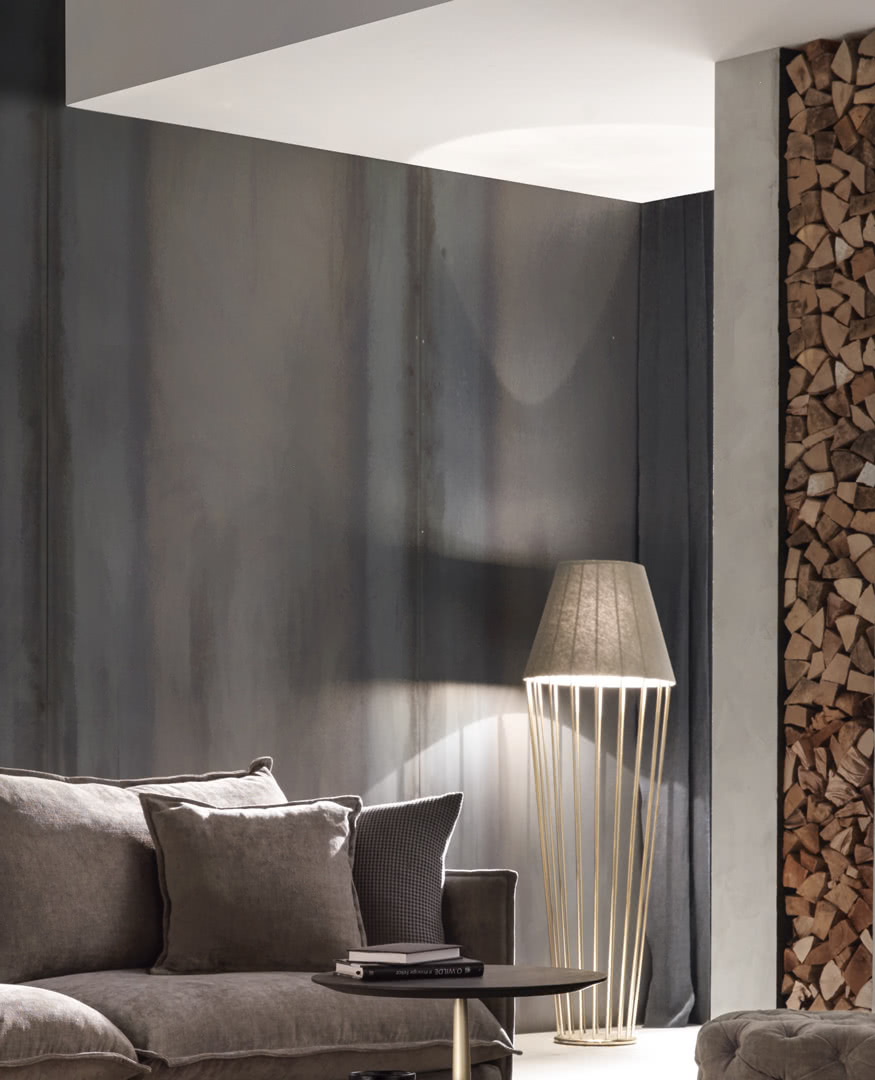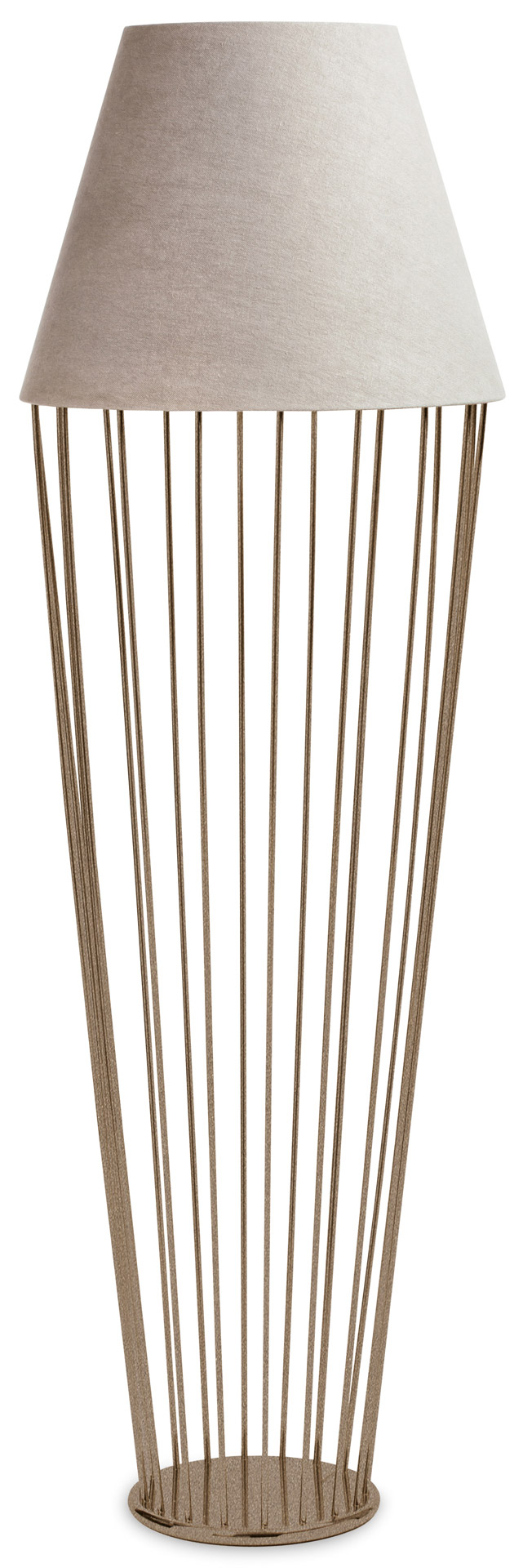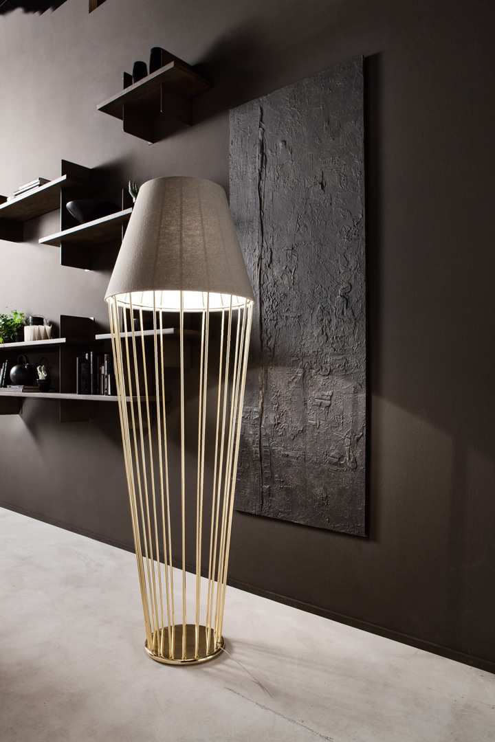 La struttura a gabbia è realizzata in tondino di acciaio e fusione di ottone, con saldature a filo e ottone, e finitura in galvanica oro, rame, nichel nero o ferro metallizzato. Il paralume a tronco di cono è in cotone o lino accoppiato. Una lampada da terra dal design moderno ma adatta ad ogni stile, perfetta in una sala anche in composizioni realizzate con lampade Sofia di diverse dimensioni.