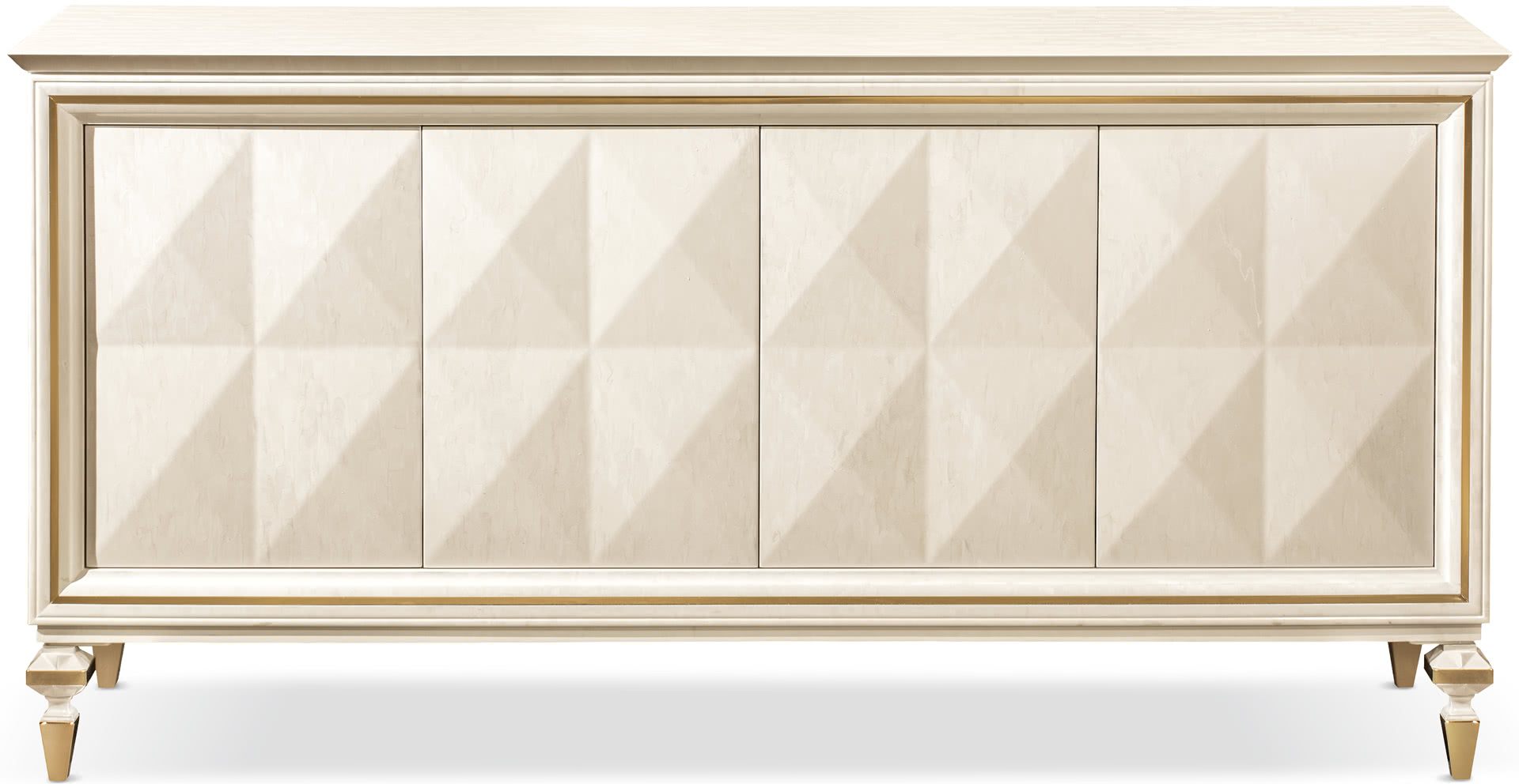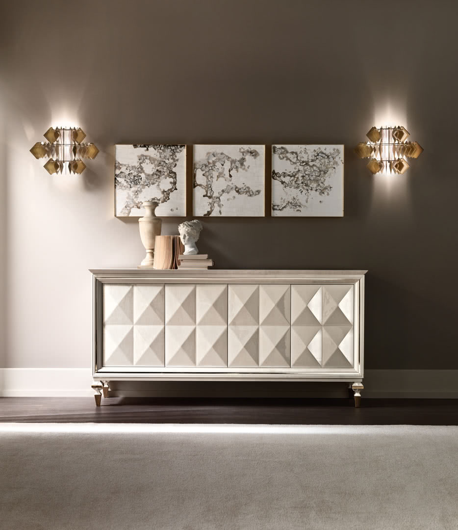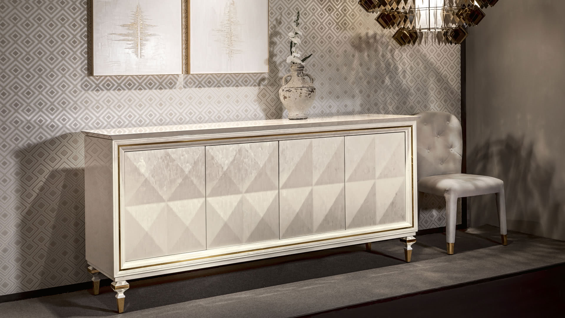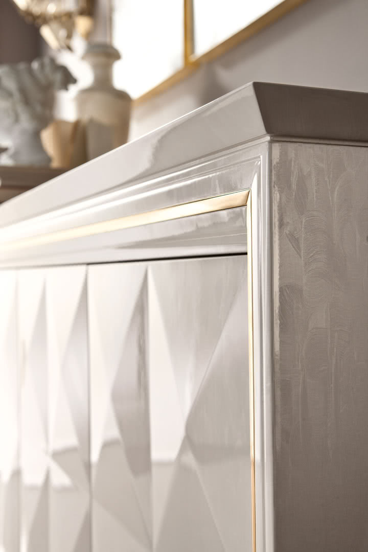 Internamente è divisa con due vani, ognuno con un ripiano in vetro. Le bugne sulle ante formano un taglio a forma di diamante, che riflette la luce fornendo toni diversi alla decorazione in madreperla mentre la cornice in legno con intarsio in oro ne risalta la lavorazione artigianale. Anche i piedi in legno, che sostengono il mobile, sono realizzate per formare un gioco di facce e di luce.