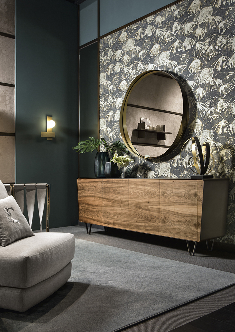Feet and handles made with shaped steel rod, crystal glass top. The matt lacquered interior can be customized in the colours, while there are three available decorations for the front: "wisteria", "vintage" gold leaf, "storm". The vintage gold leaf decoration is created by hand, applying one entire piece of gold leaf on a dark bronze coat. Although it may seem randomly applied, the decoration is in truth very accurate; the gold leaf is a thin layer laid very gently and with great aesthetic sensitivity, to give the right light between one layer and the other. In the “wisteria” decoration liquid chalk is carefully poured on the light coat. Next step: wisteria flowers and branches are painted by hand on the mother-of-pearl base coat, fllowing the pattern previously created. Chalk, acrylic paint and spatula are the elements of the “storm” decoration: combined together they create an impressive three-dimensional effect.