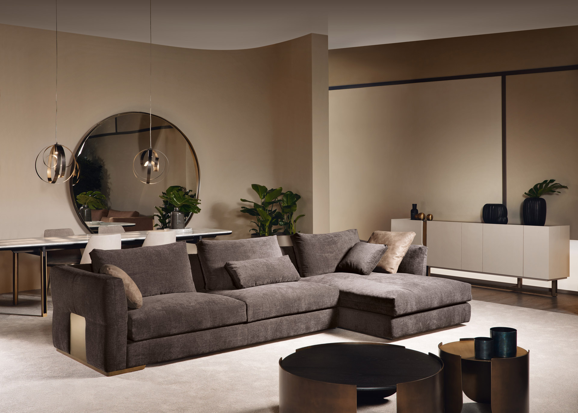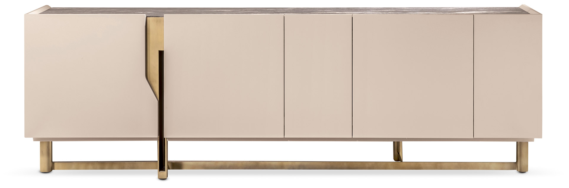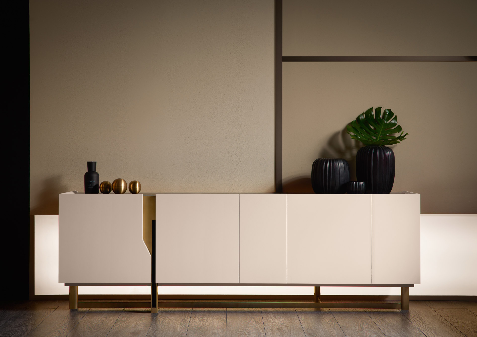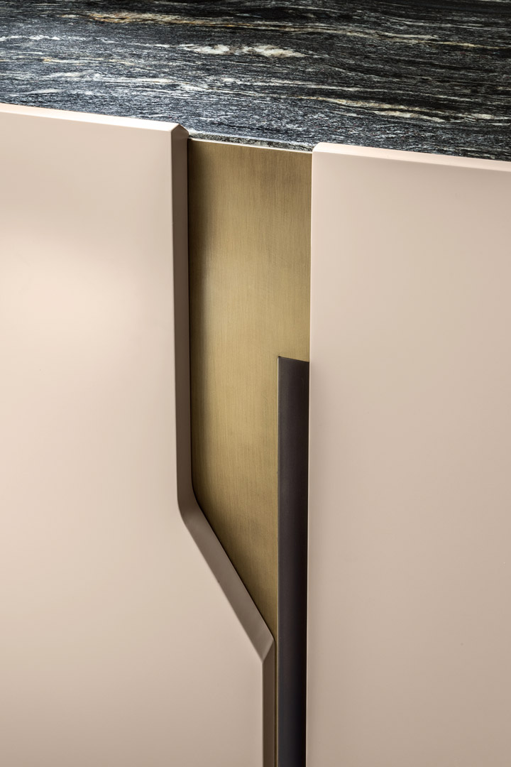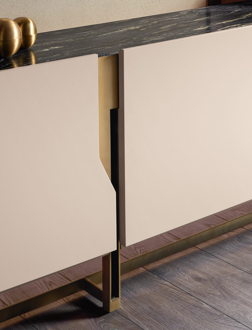 The structure is in wood and the base is obtained from a single metal block that has been hollowed out and hammered on the inside. The upper part can be embellished with a marble or covered surface. The unique opening of the side doors, conceals the contrasting interior in Moroccan-earth orange. Combinations of full and empty spaces, finishes and contrasts, result in alternating light and shade effects that bring to mind the settings around geometrically pure shapes. A perfect sideboard for a modern living area.