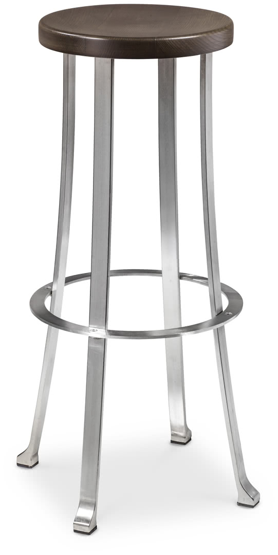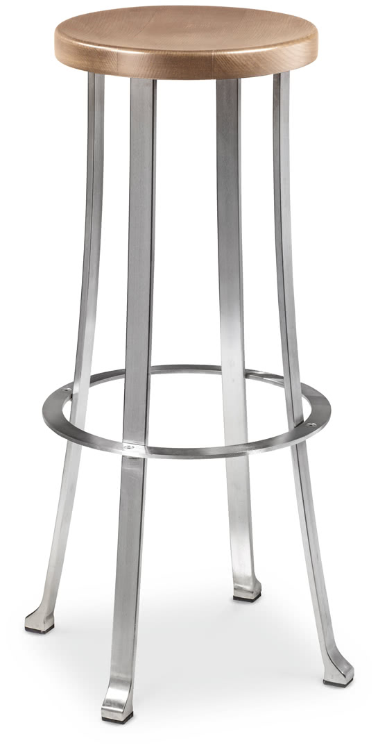 La struttura è realizzata in acciaio inox satinato, tagliato a laser, curvato e sagomato, mentre la seduta è in massello di rovere tornito e protetto con un'apposita vernice trasparente. è disponibile in due altezze: 80 e 72 cm.