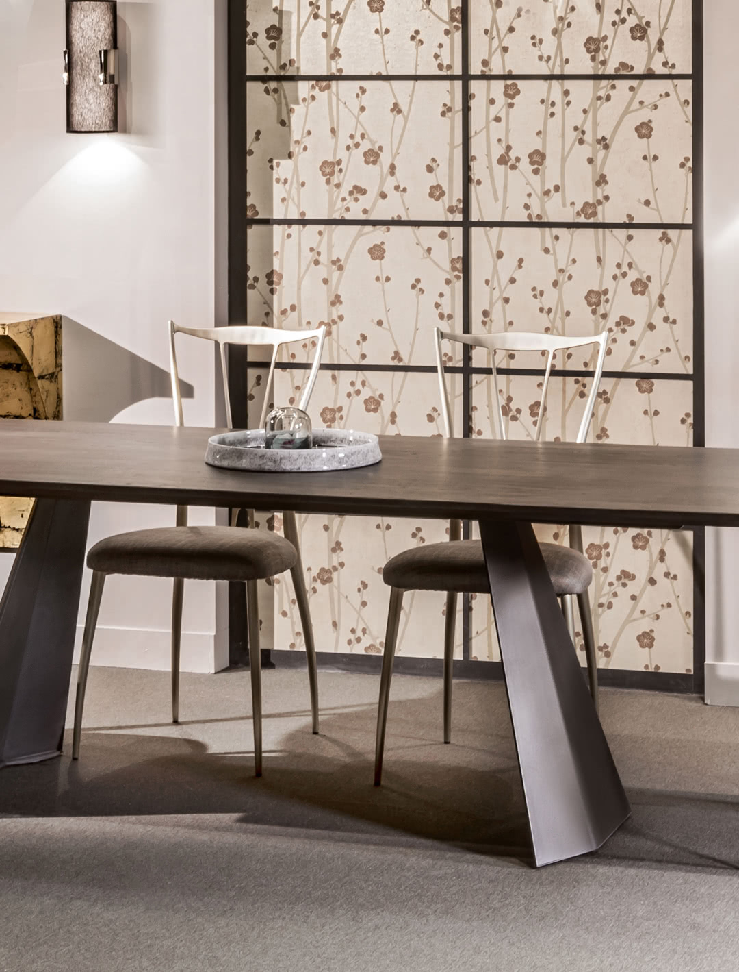 Nel dettaglio la struttura è in ferro conificato e sagomato a freddo, mentre lo schienale è tagliato a laser e curvato. La seduta in legno sagomato, è imbottito in gomma a due densità e rivestito sartorialmente in tessuto sfoderabile o in pelle/ecopelle non sfoderabile. Le sedie Vilma New si vestono d’oro per impreziosire i momenti di festa.