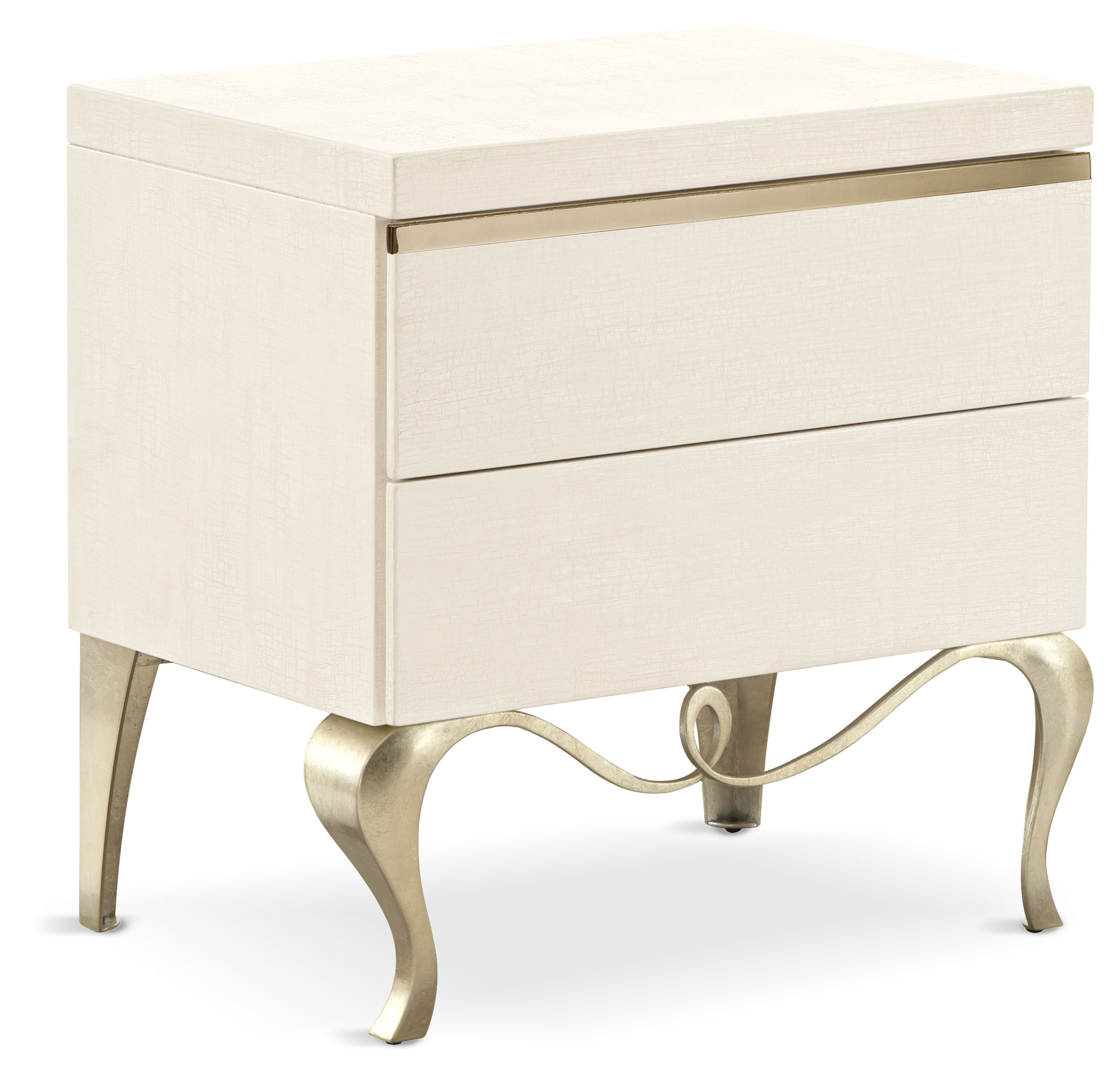 La struttura in legno presenta 2 cassetti con inserto in oro pallido e guide ad estrazione totale e richiamo frenato. I piedi e il telaio sono realizzati in ferro, decorati in foglia argento champagne. I comodini Ghirigori New, insieme al comò, creano un gruppo notte elegante e unico.
