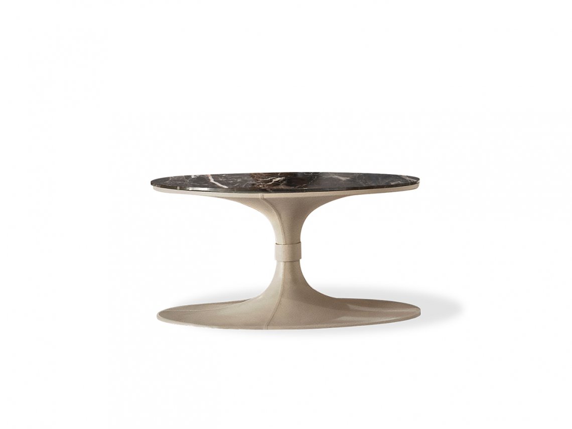 The side table Donald has an “oval trumpet shape” structure and a marble top rests on its upper part. Unlike the other tables in the same collection, the metal structure is completely covered with sartorially tooled leather with double-stitched seams that enhance the wedge-shaped design of the upholstery. With a simple but elegant shape it adapts perfectly to a variety of different furnishing solutions, but it is particularly suitable for a living area. It is available in one size.