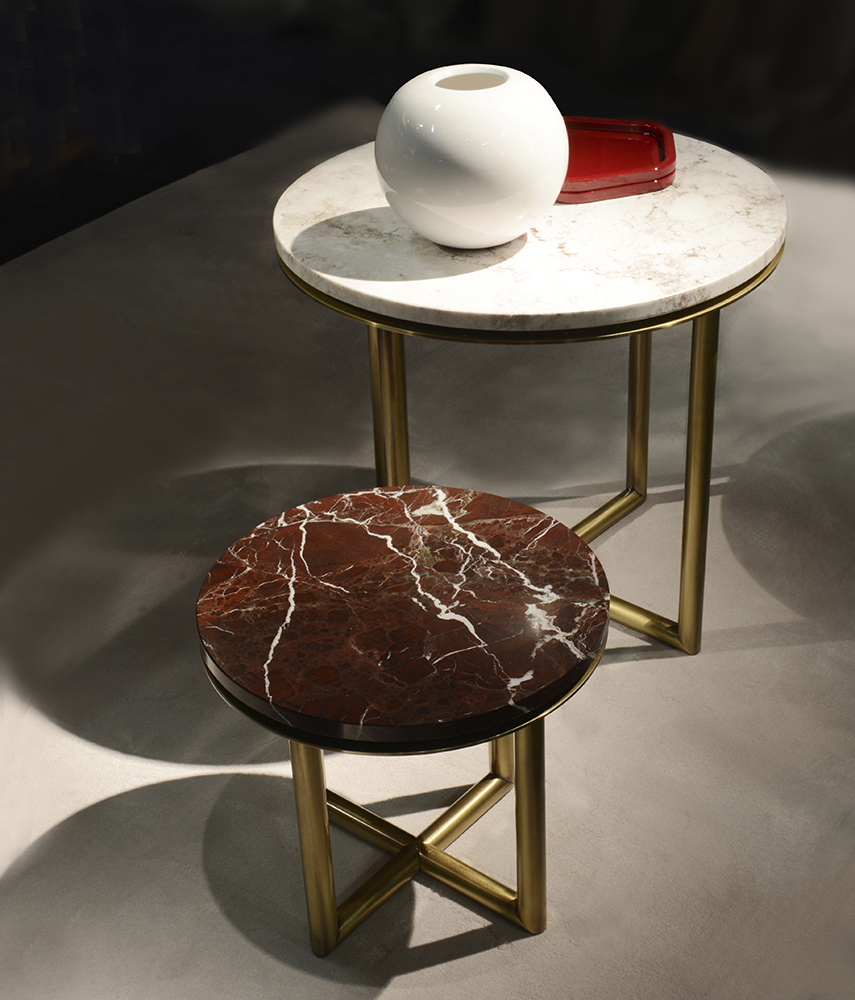 The collection of coffee tables Grant is characterized by a metal base with a tubular cross motif that gives them further elegance and refinement. The precious marble top is supported by a metal edge, which increases its thickness. The collection offers a variety of sizes and heights, to fully meet the needs of a living area with a complex design and different pieces of upholstered furniture.
