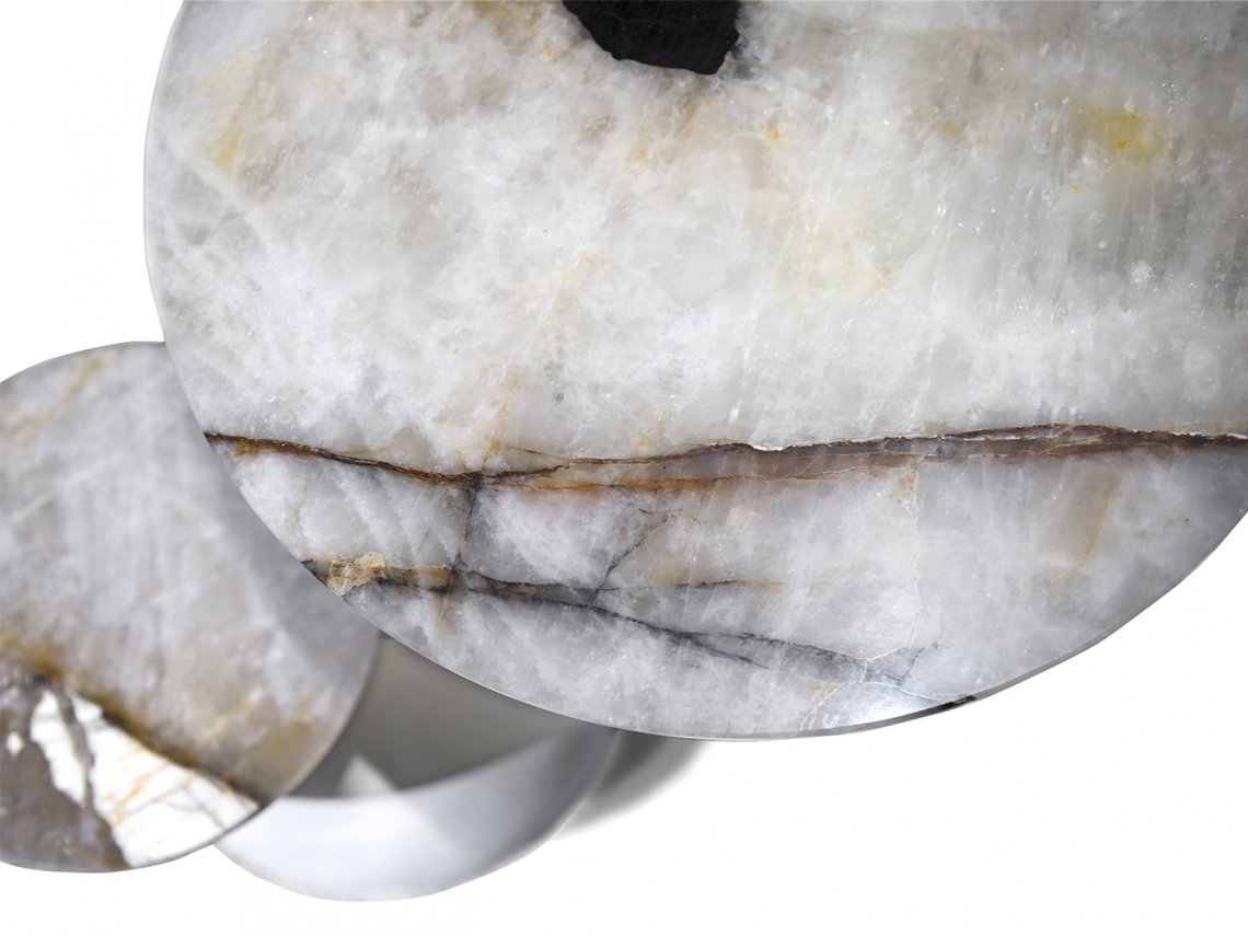 It is a coffee table result of a continuous desire to experience. The base is unusually composed of two vase-shaped bodies different in size and which seem fused together. At the top end there are two circular marble tops with different diameters. The double structure of this coffee table is in ceramic with a three-dimensional finish that can be traced back to the texture of a woven fabric. This piece is particularly suitable for those who are always looking for unique pieces.