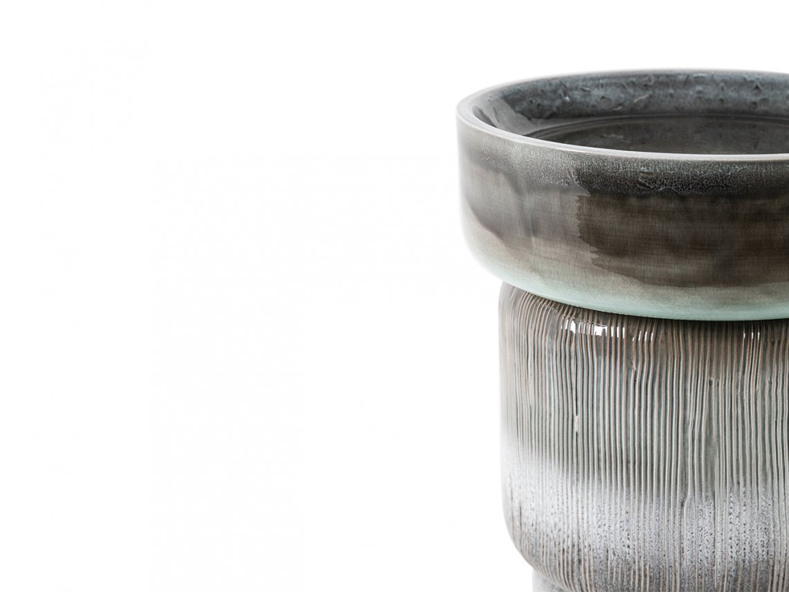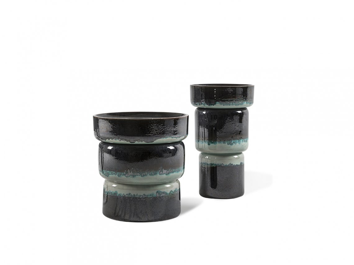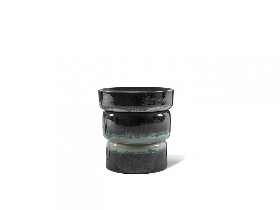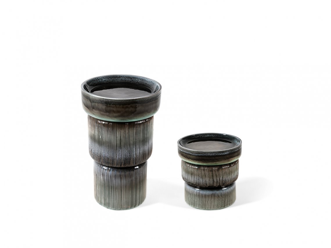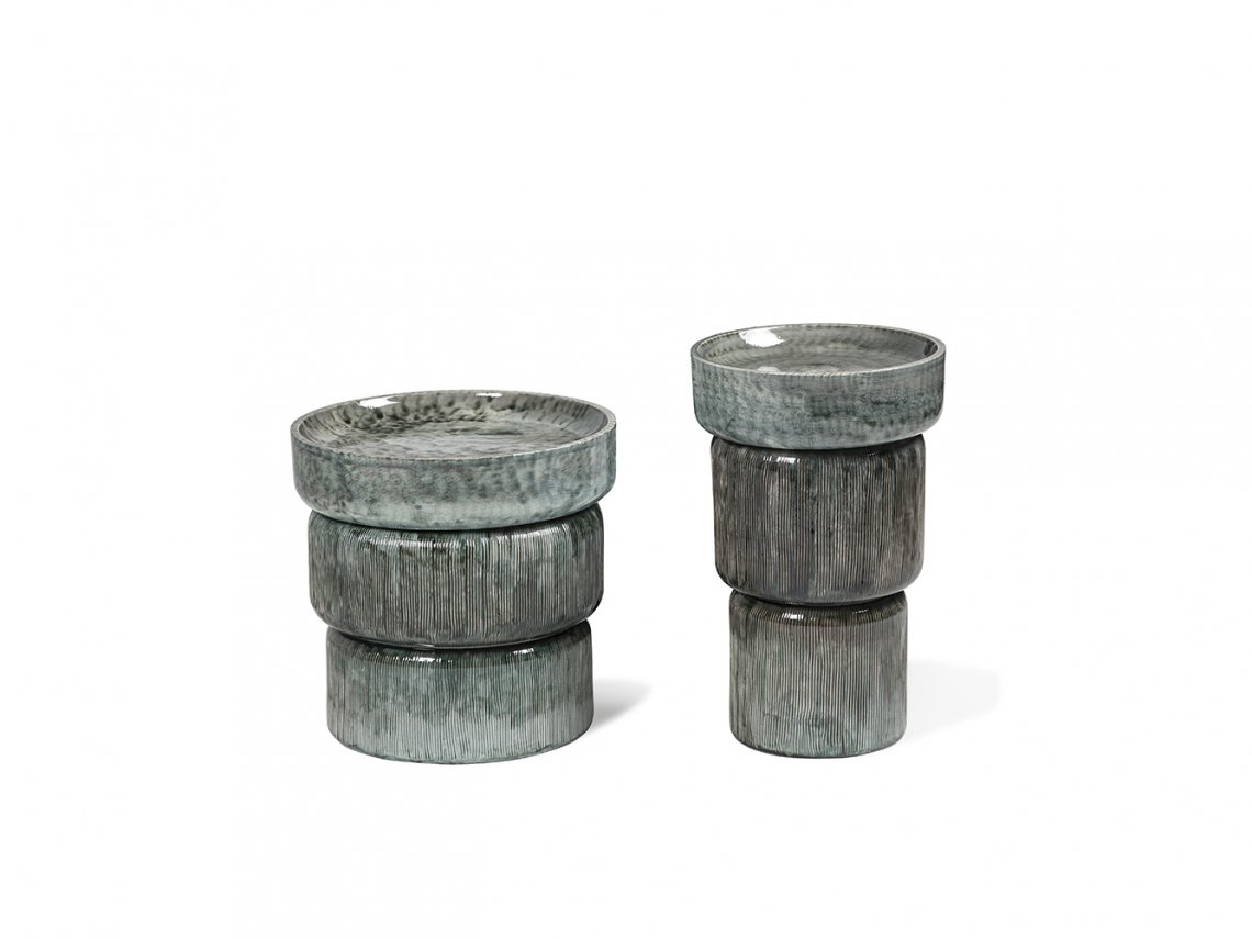 The Pedro collection shows a great manual skill in making pottery. Made of one material, the simplicity of their shape is enhanced by an ancient finishing technique that creates a play of shades by mixing glaze with natural powders. Thanks to the uniqueness of the pottery making process each single piece is one-of-a-kind because of similar but different shades that originate during the porcelain firing. This side table is available with a smooth surface and partially decorated with vertical grooves.
