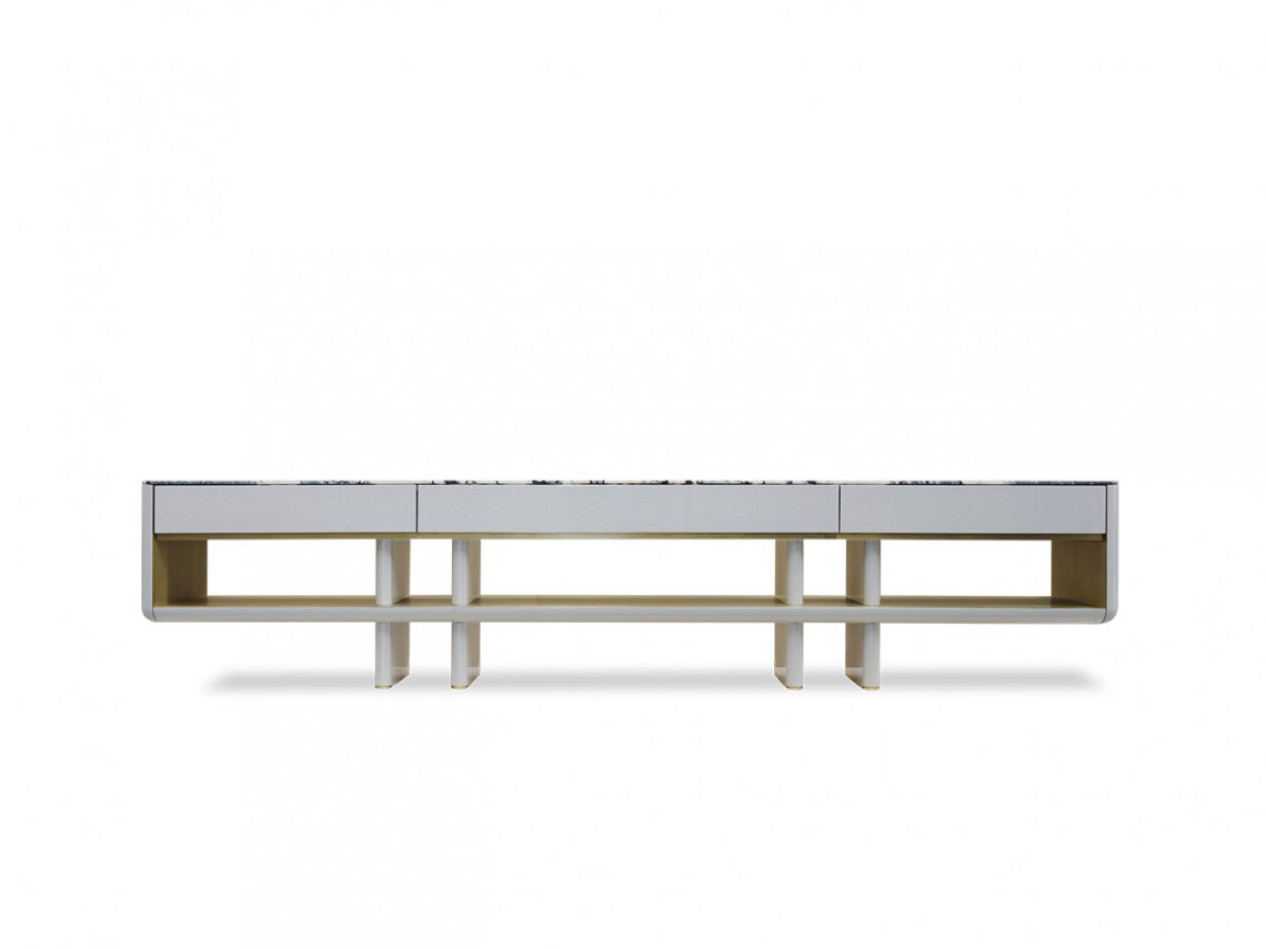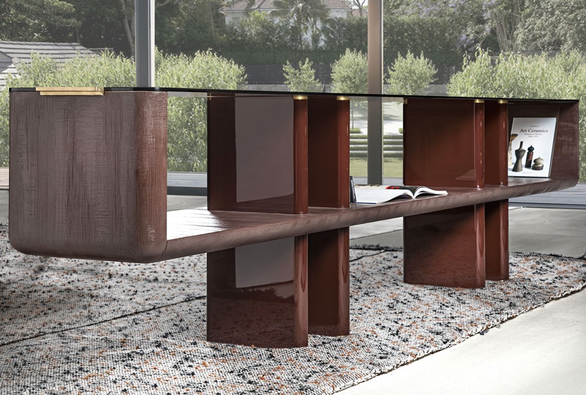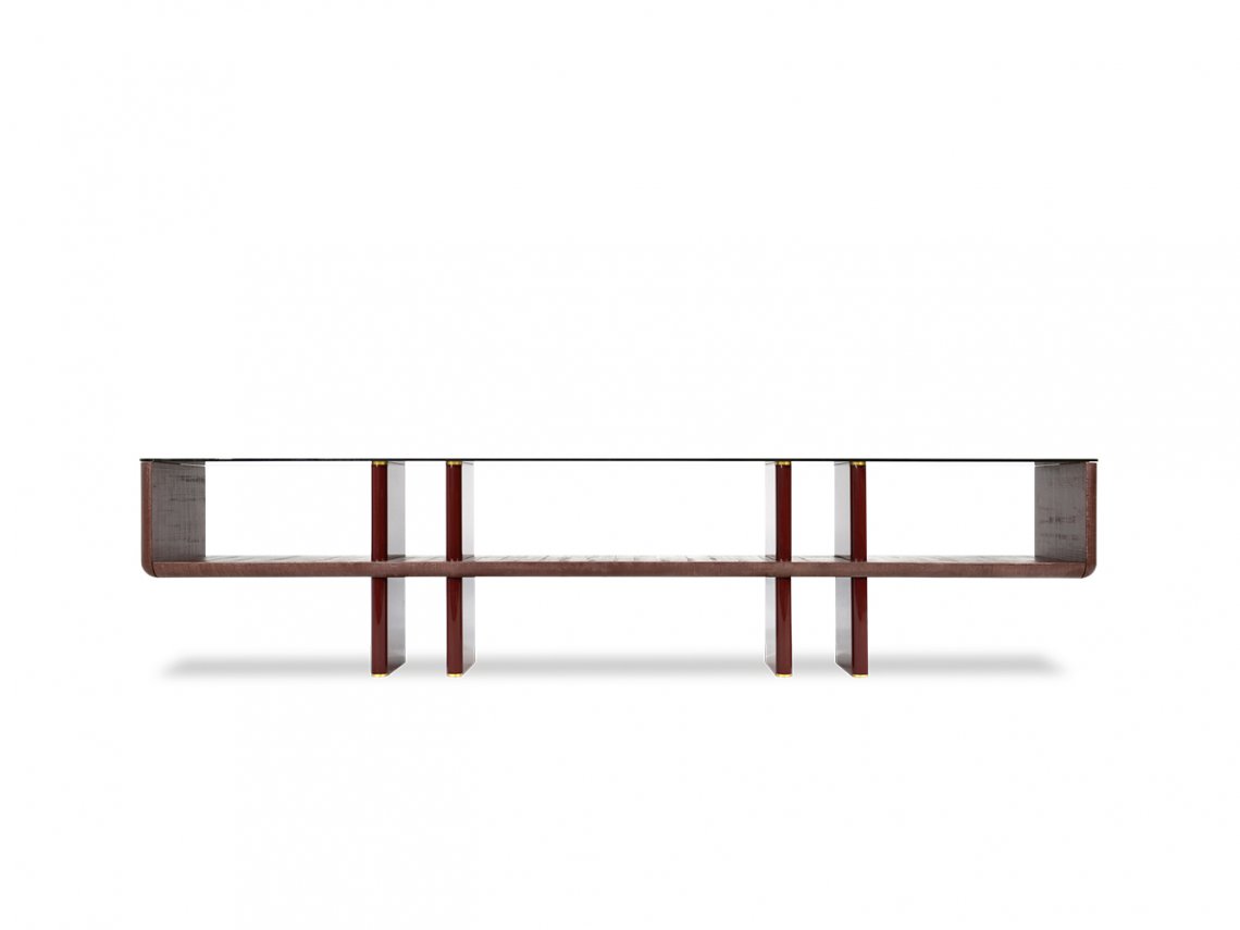 Bridge storage unit represents an interesting solution to separate a living area from a dining area. The bronze glass top let the internal side be visible and the refined structure is supported by four slight legs enhancing a sophisticated look to the environment. The matt lacquered finish with “ textile texture” effect is in contrast with the rounded shiny lacquered legs.