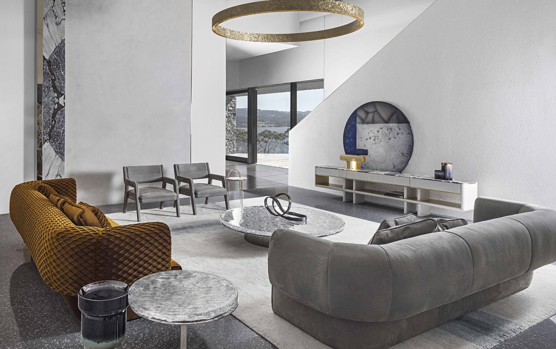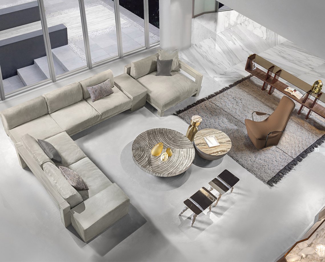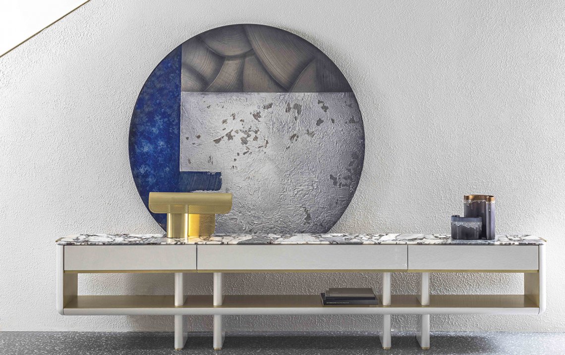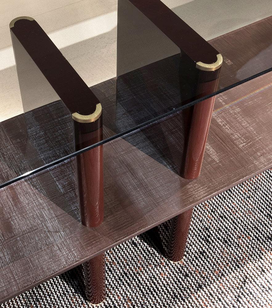 Bridge storage unit represents an interesting solution to separate a living area from a dining area. The bronze glass top let the internal side be visible and the refined structure is supported by four slight legs enhancing a sophisticated look to the environment. The matt lacquered finish with “ textile texture” effect is in contrast with the rounded shiny lacquered legs.