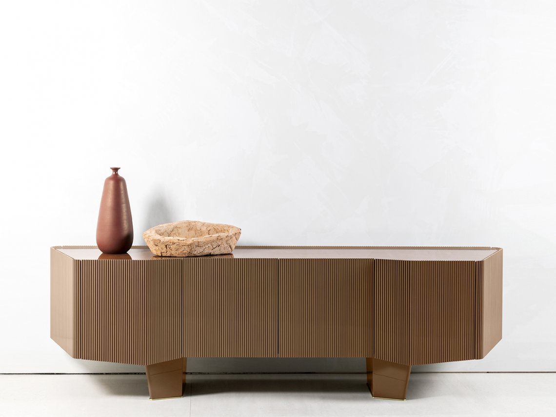 Diamond is a storage unit with contemporary lines particularly suitable for an eclectic living area. The double ”L” shaped bases supports a storage unit with doors finely ribbed. All available finishes have been selected from a range of natural colours that can be easily combined with other pieces. It is available with 3 or 4 doors, each end door opening outwards. A modern and exclusive look, in which art and design coexist in perfect harmony, is reached thanks to the linear design skills that distinguishes it.