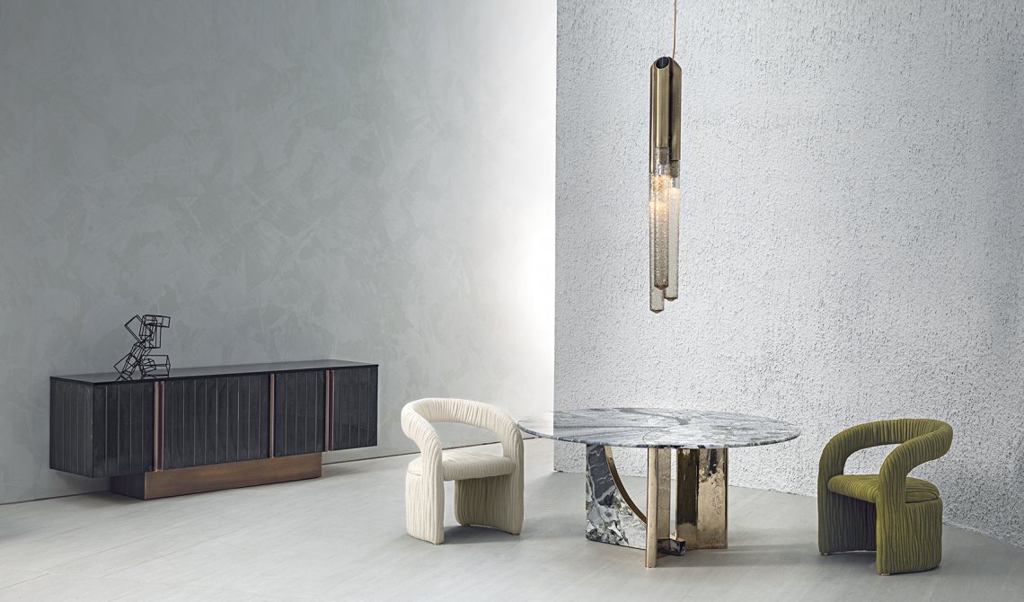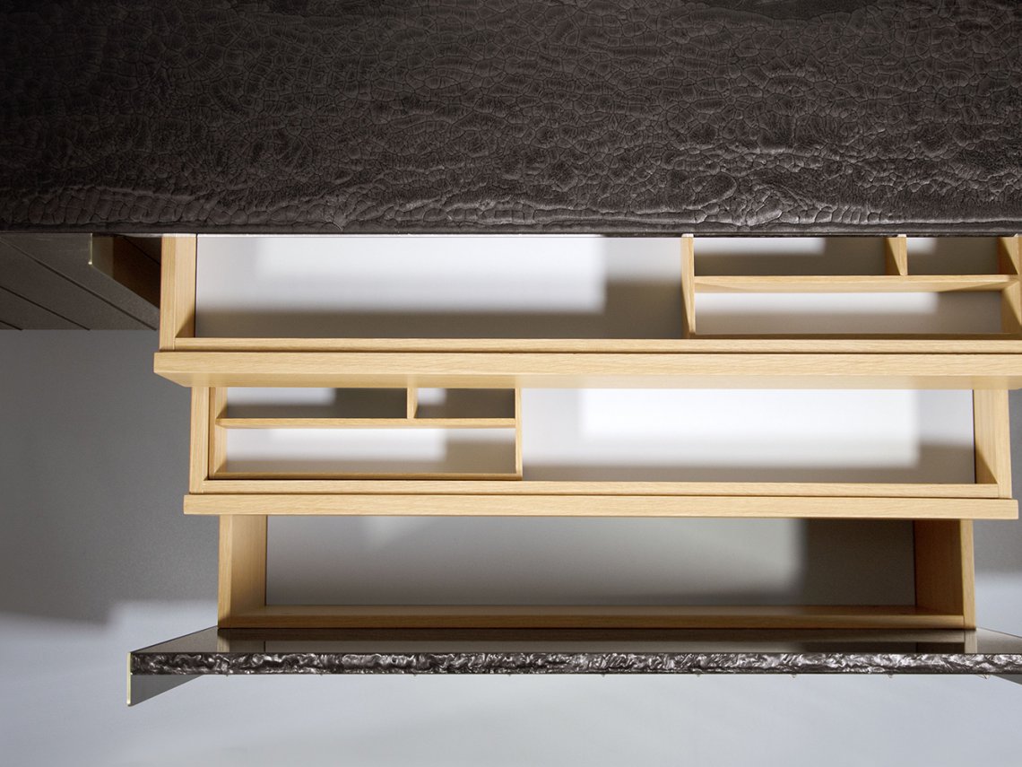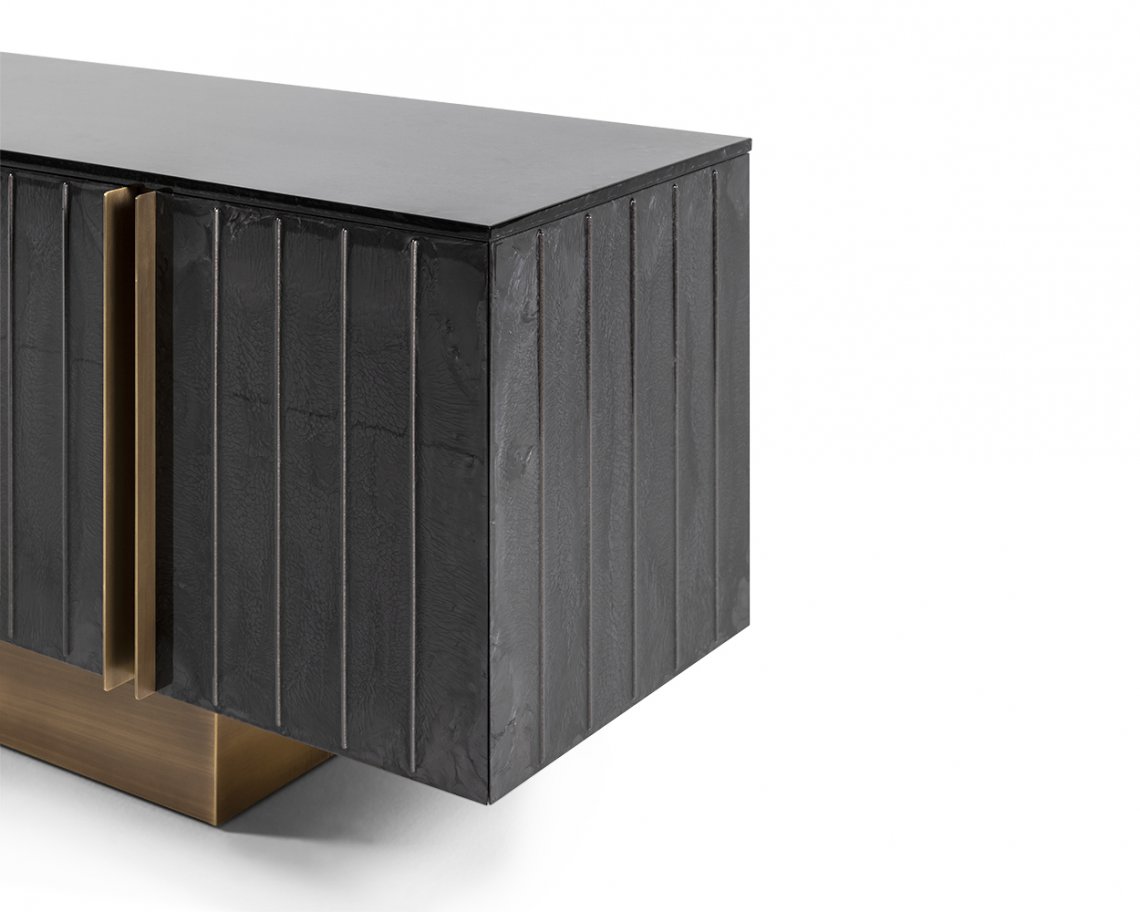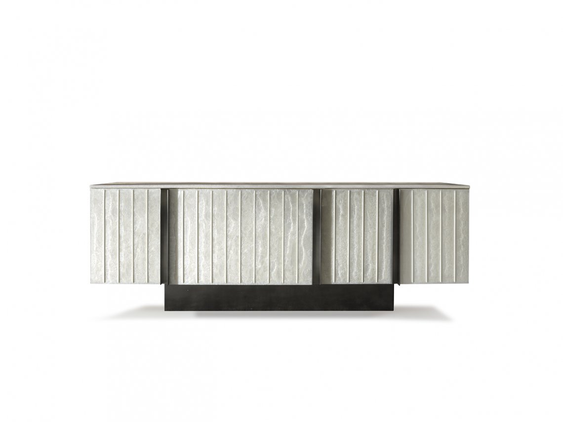 Domino storage unit suggests a perfect balance between design and materials used like decorative resin, colored pigments and natural finishes. The main features of this item are represented by vertical lines and three-dimensionality of the doors where metal inserts are not only decorative but also functional to open them. The bottom parts of the drawers are upholstered with saddle leather, a precious material that matches really well with oak wood used for internal structure. The refinement of this storage unit may be exalted if combined with marble tables.