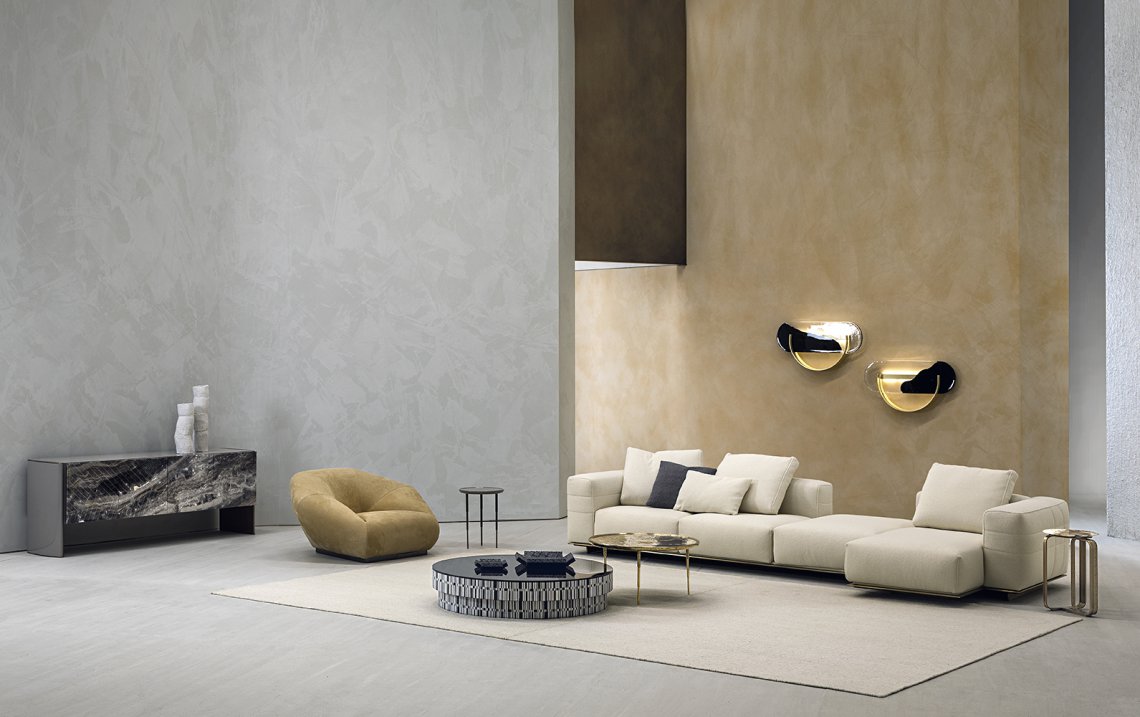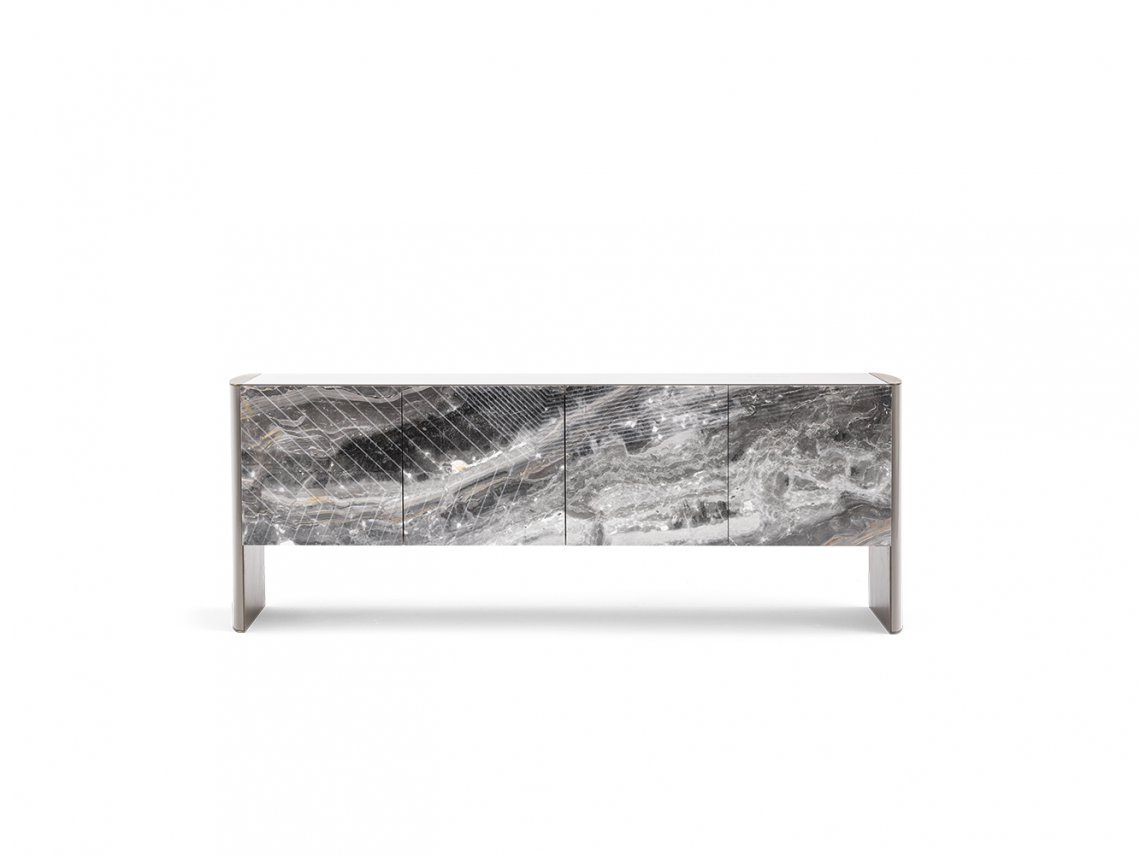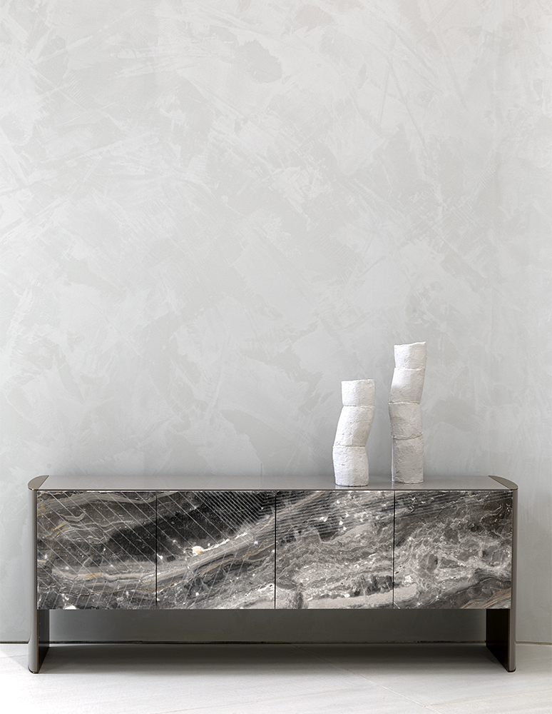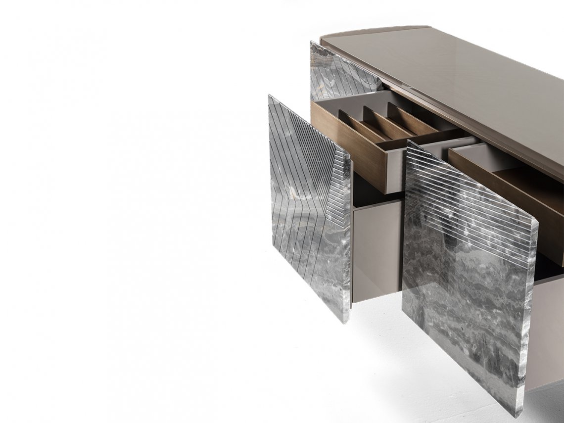 The storage unit Linfa is an example of combination of different raw materials able to enhance preciousness to this piece of furniture. Marble inserts become drawer frontals that match with the rounded lacquered structure while metal parts become decorative details that separate the marble from the structure itself. Arabescato Orobico marble is in perfect harmony with the brushed dark bronze finish metal. Metal and leather are also characterizing elements in the two smaller drawers that can contain precious assortments of cutlery.
