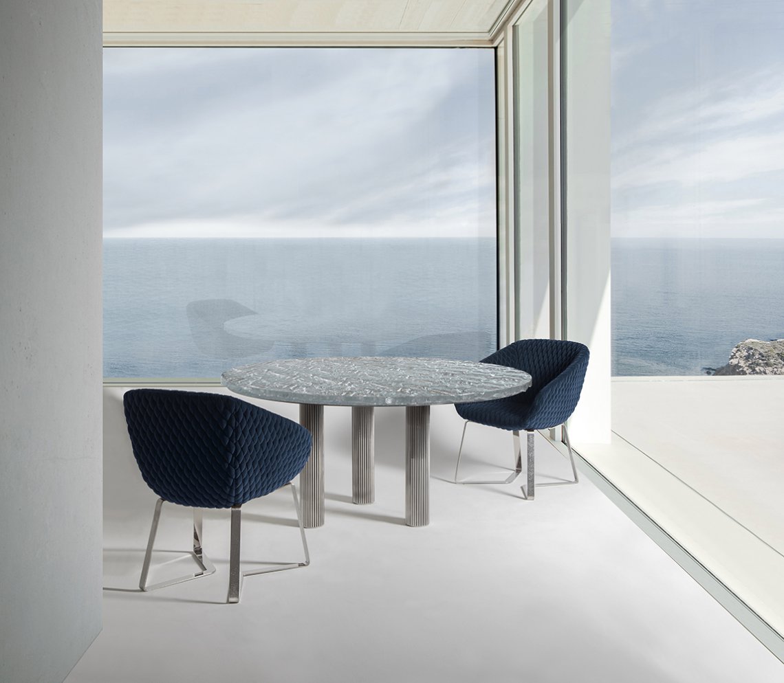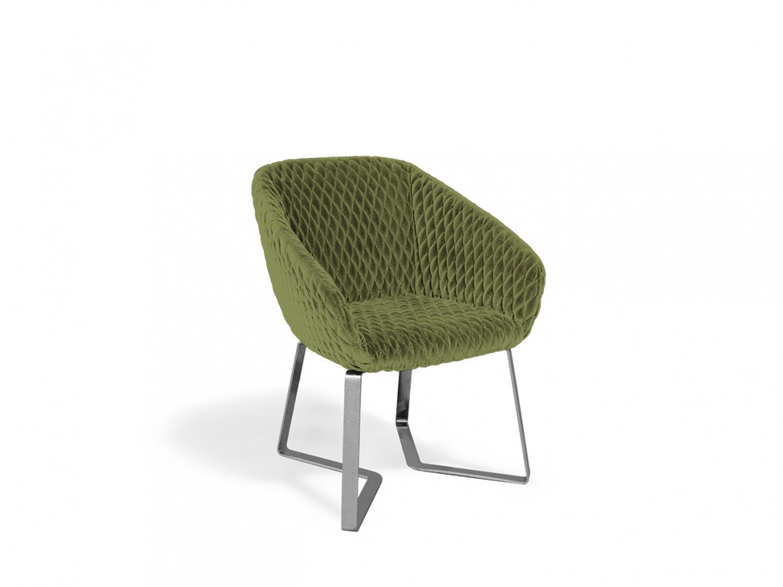 The armchair Oliver is a piece that recalls the style of the 50s. The whole seat is wrapped in a diamond-shaped quilting that gives the surface a three-dimensional light-and-dark effect. The structure supporting the seat is made up of two metal ribbons which, embellished by hand-made sculptural work, create a pleasant geometric effect. This armchair is customizable with upholstery in leather or fabric as well as in the chromatic metal finishes.