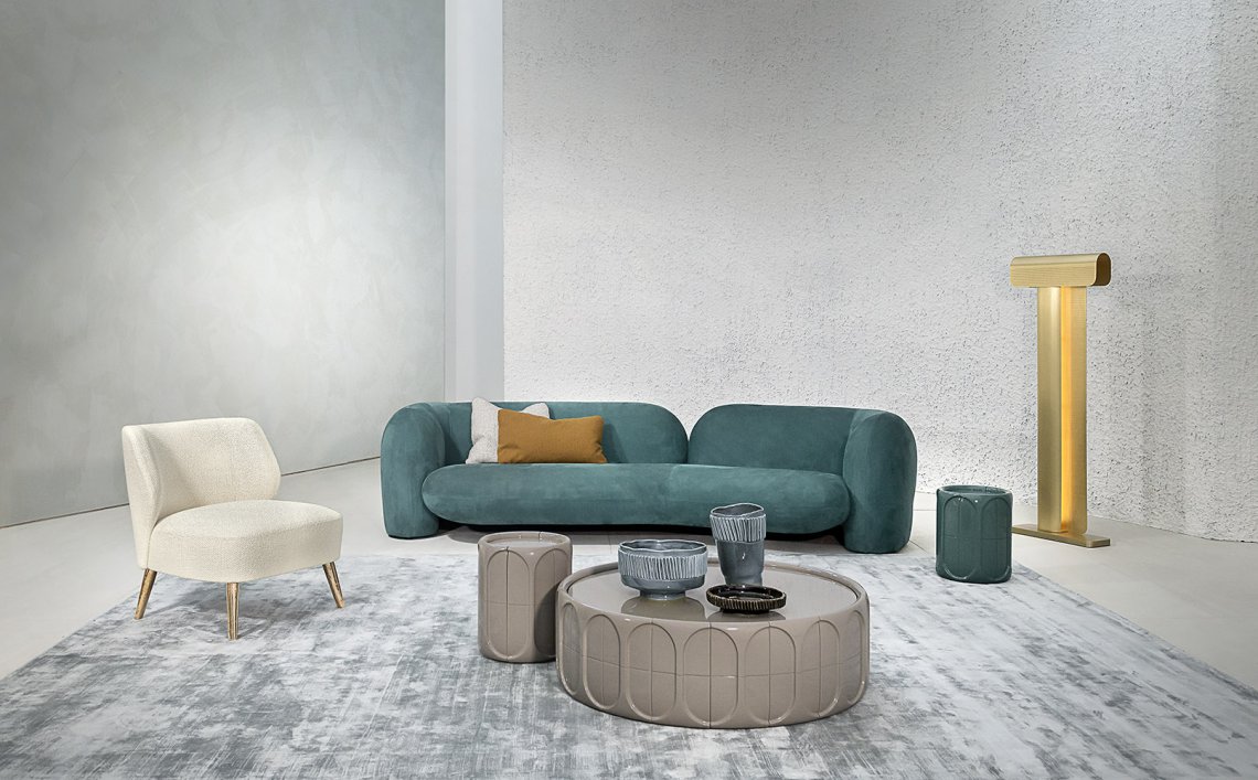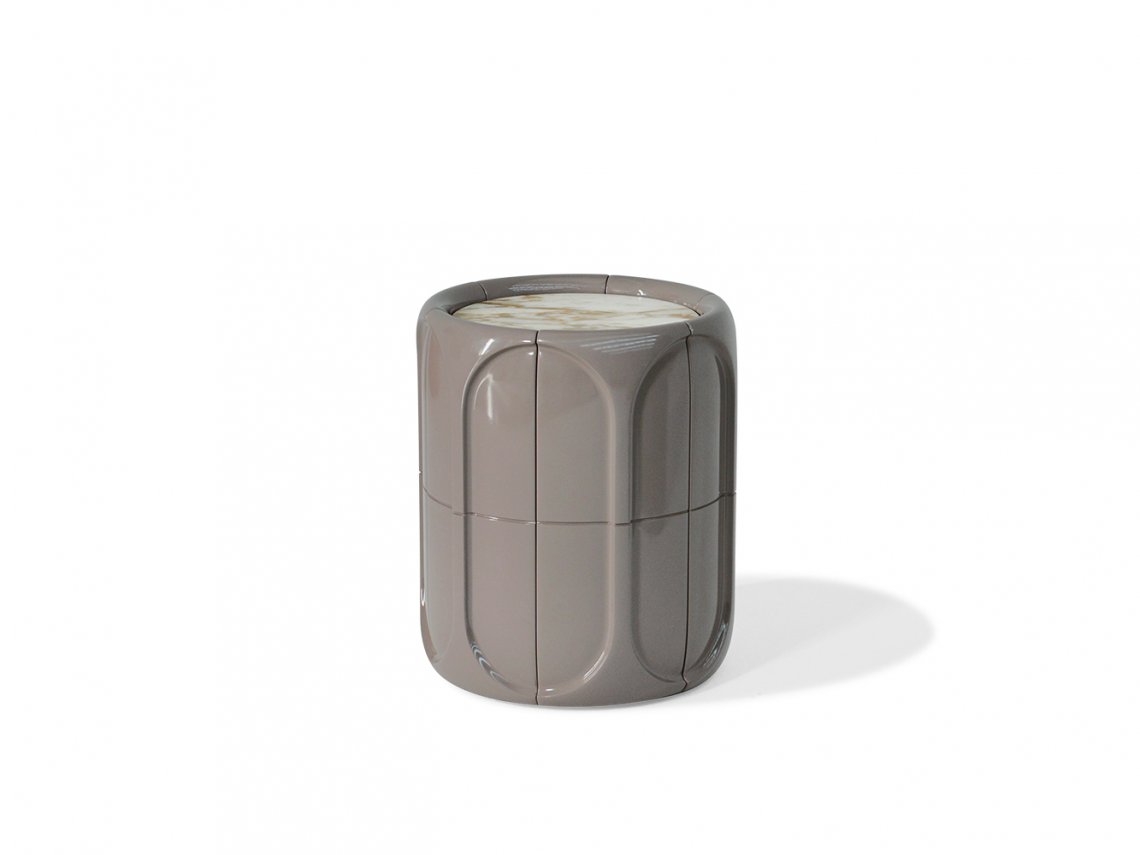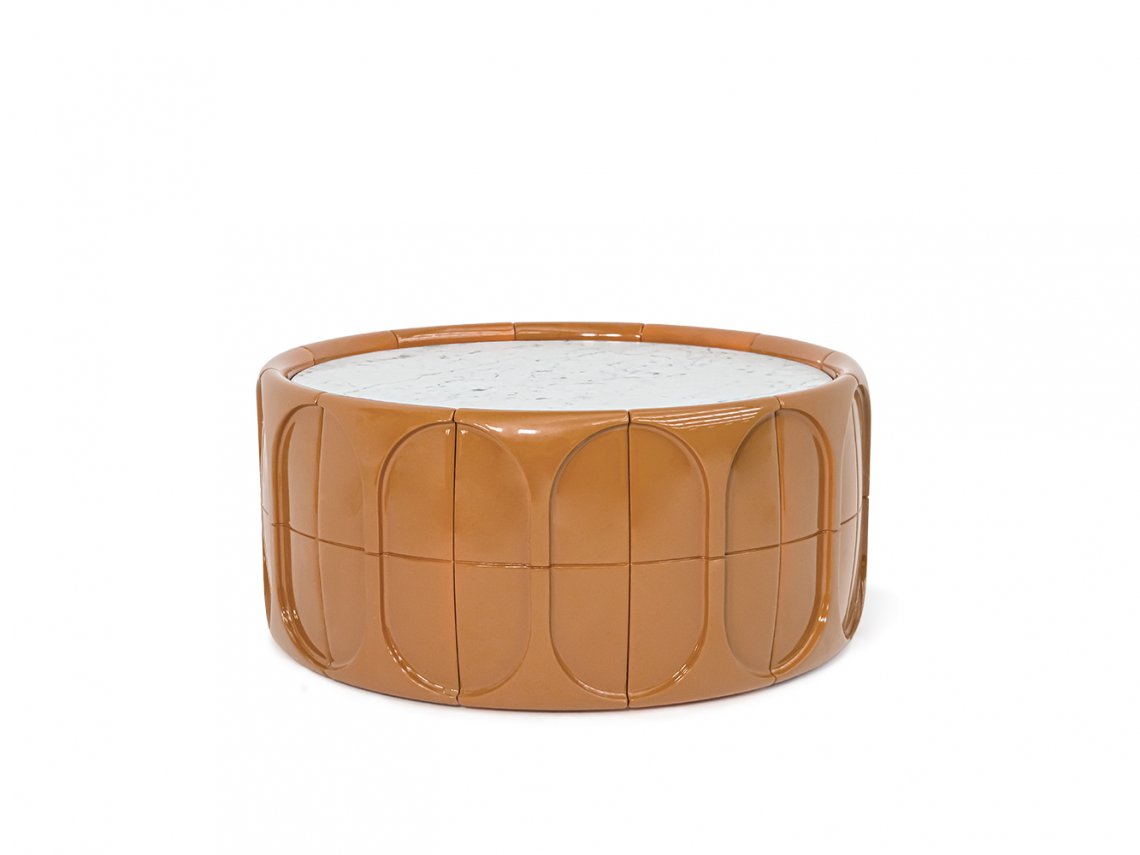 Concave coffee table enriches the living area with a sculptural touch and is characterized by a round shape embellished on the surface by many three-dimensional facets, inspired by the columns of the Roman era. It is available in various colours with a glossy or matt finish.