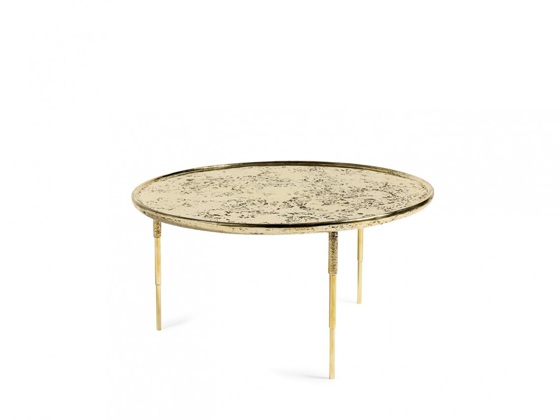 Side table Heron is a very refined element with a light and versatile design completely made of metal. The brass top is realized with a metal casting technique in a mold made of special sands. The brass legs are finished in shiny gold.