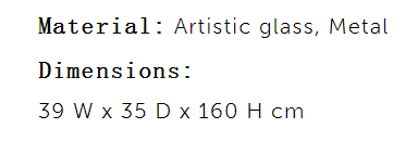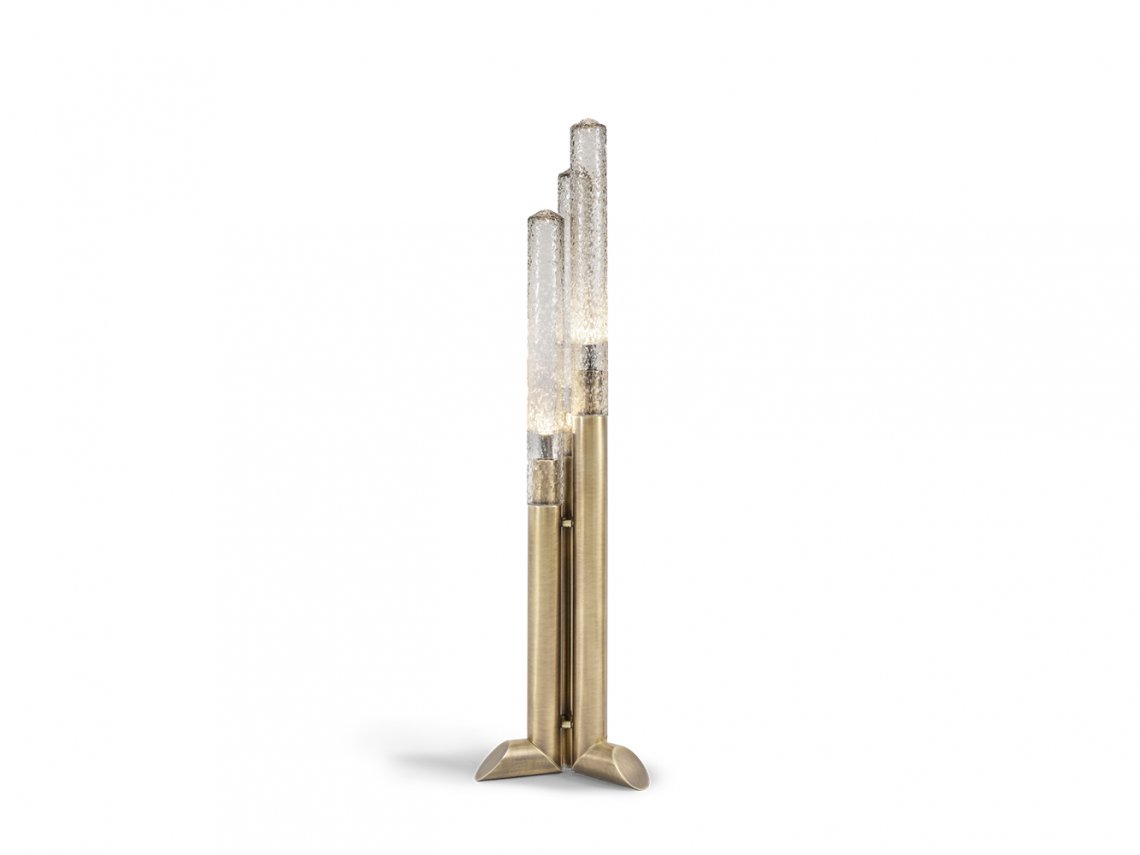 The floor lamp Lapis is composed by three metal cylinders from which tapered artistic glass elements rise. The cylinders of the structure have different heights and are in brushed bronze finish. The artistic glass elements are hand-blown by the Masters glassmakers of Venice area and their surface, once the glass is still liquid, is covered with glass grain. When crossed by the light, the glass spreads reflections into the environment thus creating an exclusive atmosphere.