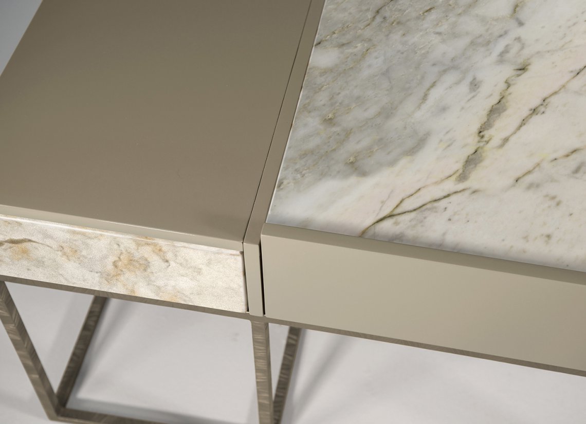 A continuous sequence of right angles defines the shape of Lineup night table. The design and proportions are the result of research inspired by the art movement ”De Stijl”, also known as neoplasticism, which is expressed by basic and geometric lines. The skillful manual method of engraving on the metal base is inspired by the working techniques of Italian premium class jewelry. In the drawers and on the top,marbles and pastel colours finished are combined in perfect harmony.