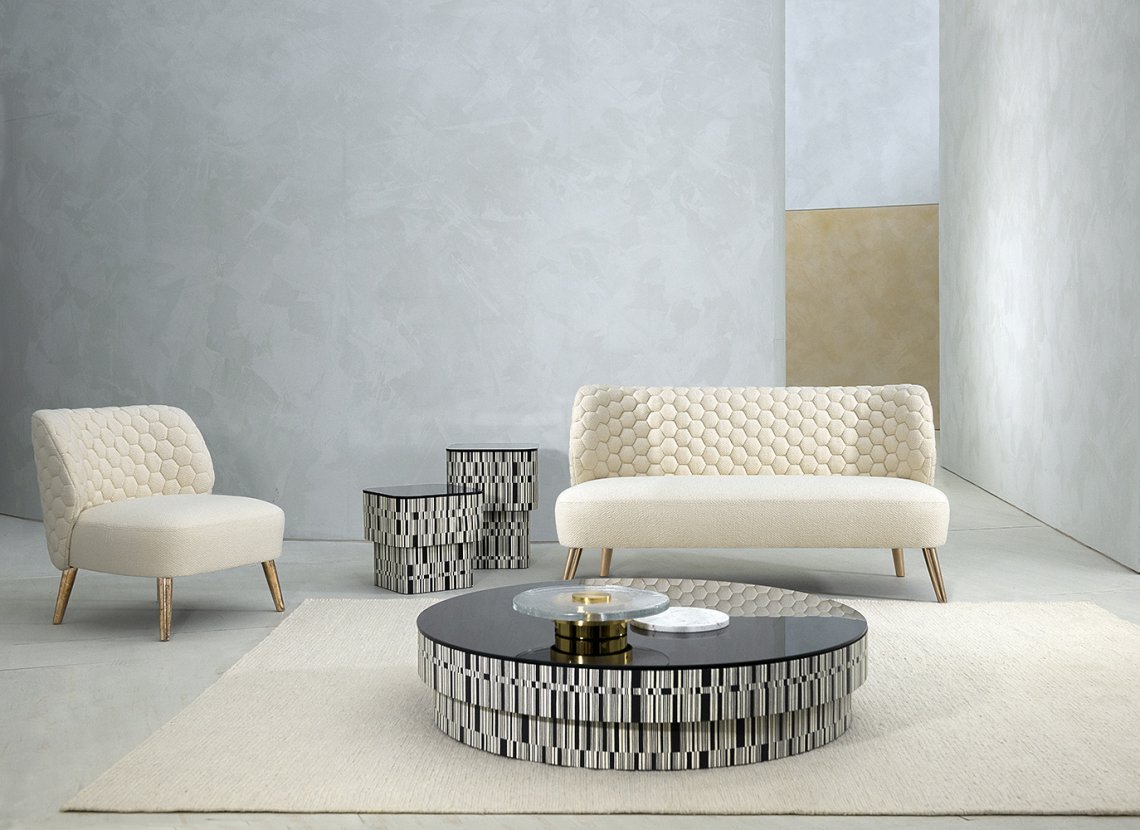 The enveloping and comfortable sofa Marilou can be upholstered only with selected textured fabrics. The backside is characterized by a quilting embroidered with hexagonal design. The bronze metal feet are realized with the ancient sand casting technique that conveys an artistic touch to the sofa.