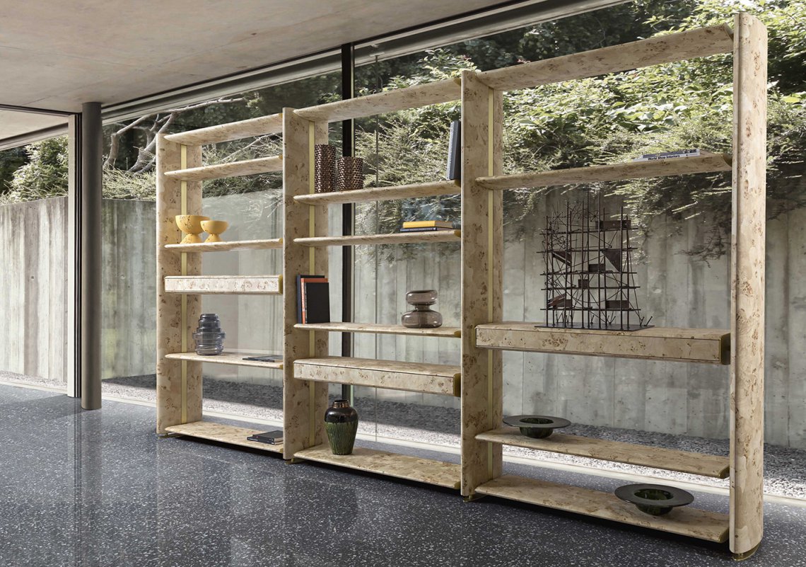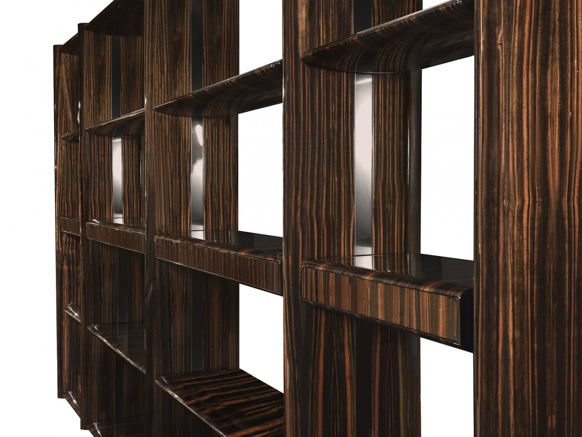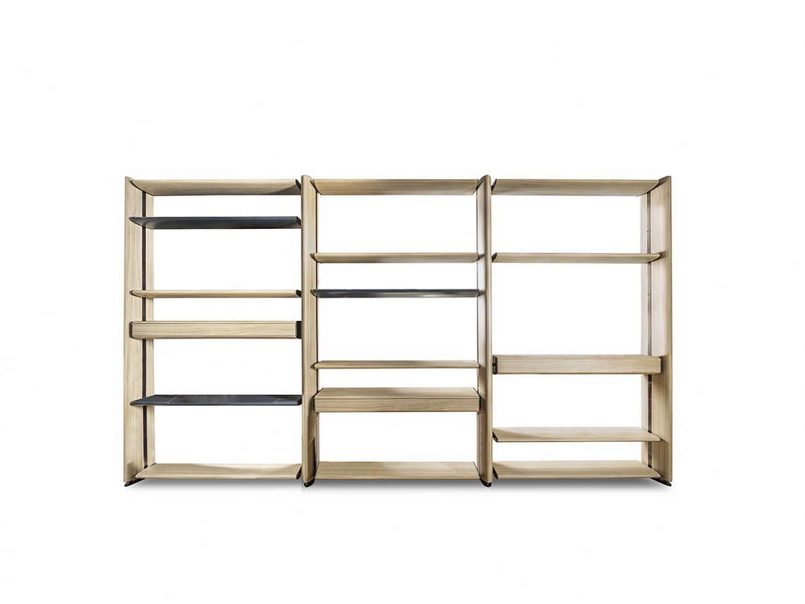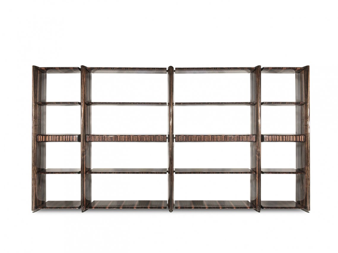 Eclipse is a modular bookcase designed to suggest a contemporary element to divide big living areas. Its soft lines make it suitable to furnish many different areas and the refined oval-shaped structure envelops the shelves supported by decorative metal details. It’s available with ebony, root poplar and oak wood.